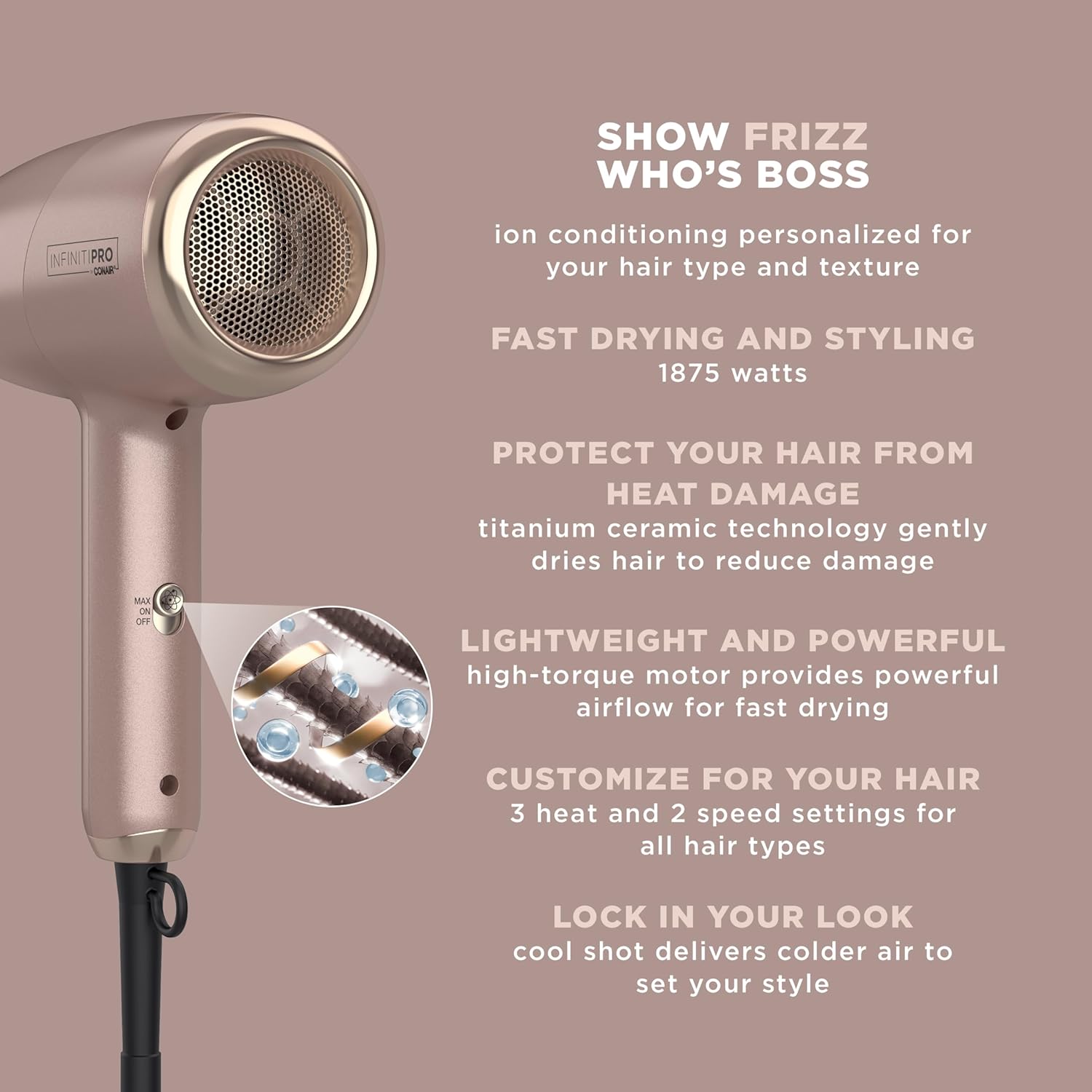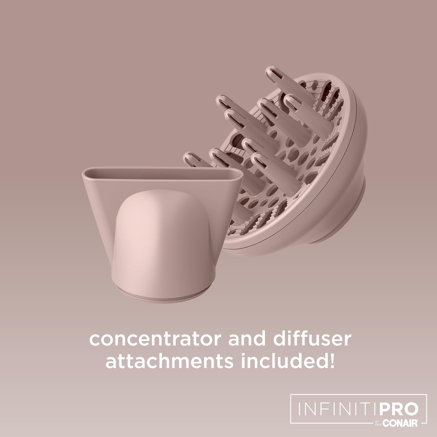 InfinitiPRO by Conair 750C Frizz Free Pro Dryer, 3 Heat/2 Speed Settings, Includes Diffuser and 2 Contentrators, Rose Gold, Hair Dryer