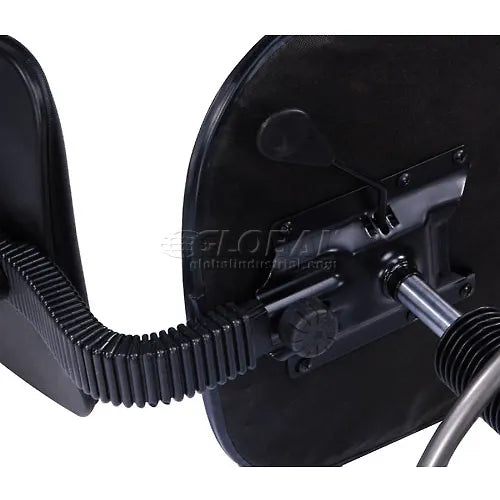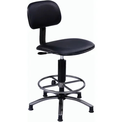 Seat features 2-1/2" thick padding with pneumatic height adjustment. Contoured back has 1" thick padding and moves in and out on a floating hinge for comfortable support. Chair swivels 360° to put work within reach. Footrest adjusts from 8-1/4" to 11-1/2"H. Durable black vinyl upholstery. Non-marring nylon floor glides. Optional casters increase chair height 2-1/2". Seat measure 19-1/2"W x 18-1/2"D. Back measures 16"W x 10"H. Brand is Interion® By Global Industrial. 1 Year Limited Warranty. Seat adjusts from 25" to 29"H.