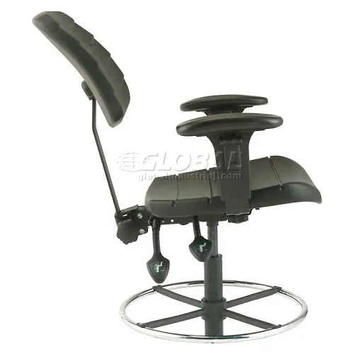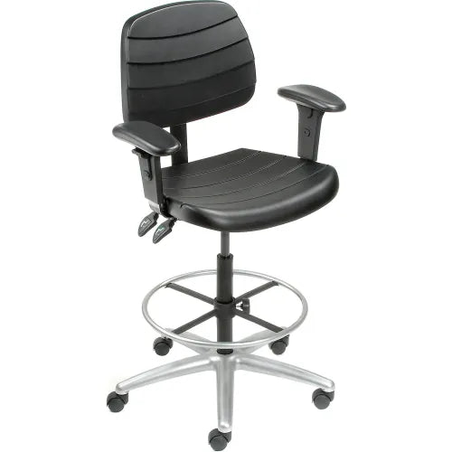 This Deluxe Polyurethane Stool is ergonomically designed and engineered to provide proper work posture that improves productivity and helps reduce fatigue. Our easy-to-clean, washable self-skinned polyurethane shop stool resists chemicals and lubricants making it ideal for lab, warehouse and workshop environments. The ribbed seat and back of this industrial polyurethane stool provides comfort and support for extended sitting periods. High density foam core and seat plate reinforcement offer wear and puncture resistance to ensure long life of this work bench stool. Ribbed back is contoured for lumbar support. Features large seat and back; Seat measures 20"W x 18"D x 2" thick. Back measures 17 ¾"W x 13 ½'€™H x 1 ½" thick. Waterfall edge seat helps improve leg circulation. Extra large 26" diameter polished aluminum 5-blade base. This swivel stool includes a 20" diameter chrome foot ring that is height adjustable. 23 -28" pneumatic seat height adjustment. Other ergonomic support featured on this adjustable shop stool includes back angle and back height adjustment. Armrests measure 4"W x 10"L and are contoured for full arm support. Armrests are adjustable up to 3" vertically and 1 ½" side-to-side. Includes both swivel casters for easy mobility and non-marring floor glides for stationary positioning. Easy assembly. 1 Year Limited Warranty.