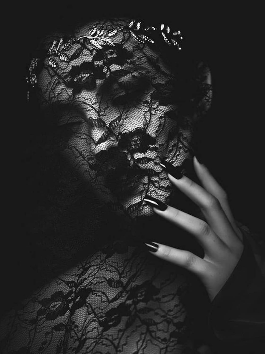 Covers the entire face—including eyes, nose, mouth, and chin—and extends toward the neck for a faceless, mysterious effect.