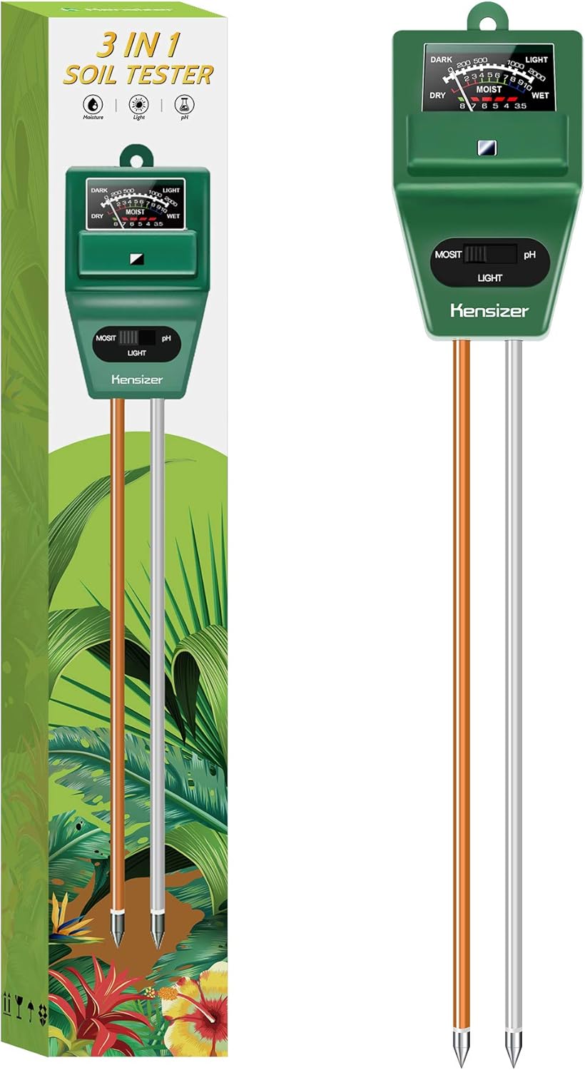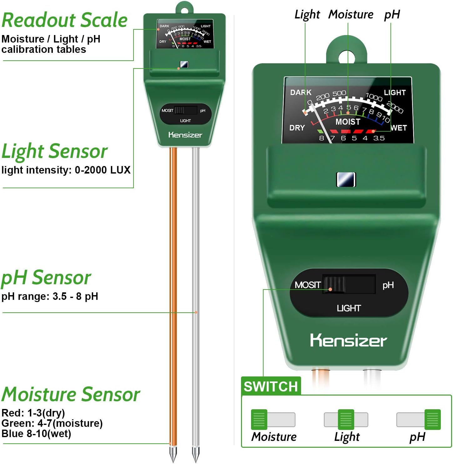 Kensizer Soil Tester, 3-in-1 Soil Moisture/Light/pH Meter, Gardening Tool kit for Plants Care, Digital Plant Thermometer, Water Meter for Indoor & Outdoor, No Battery Required