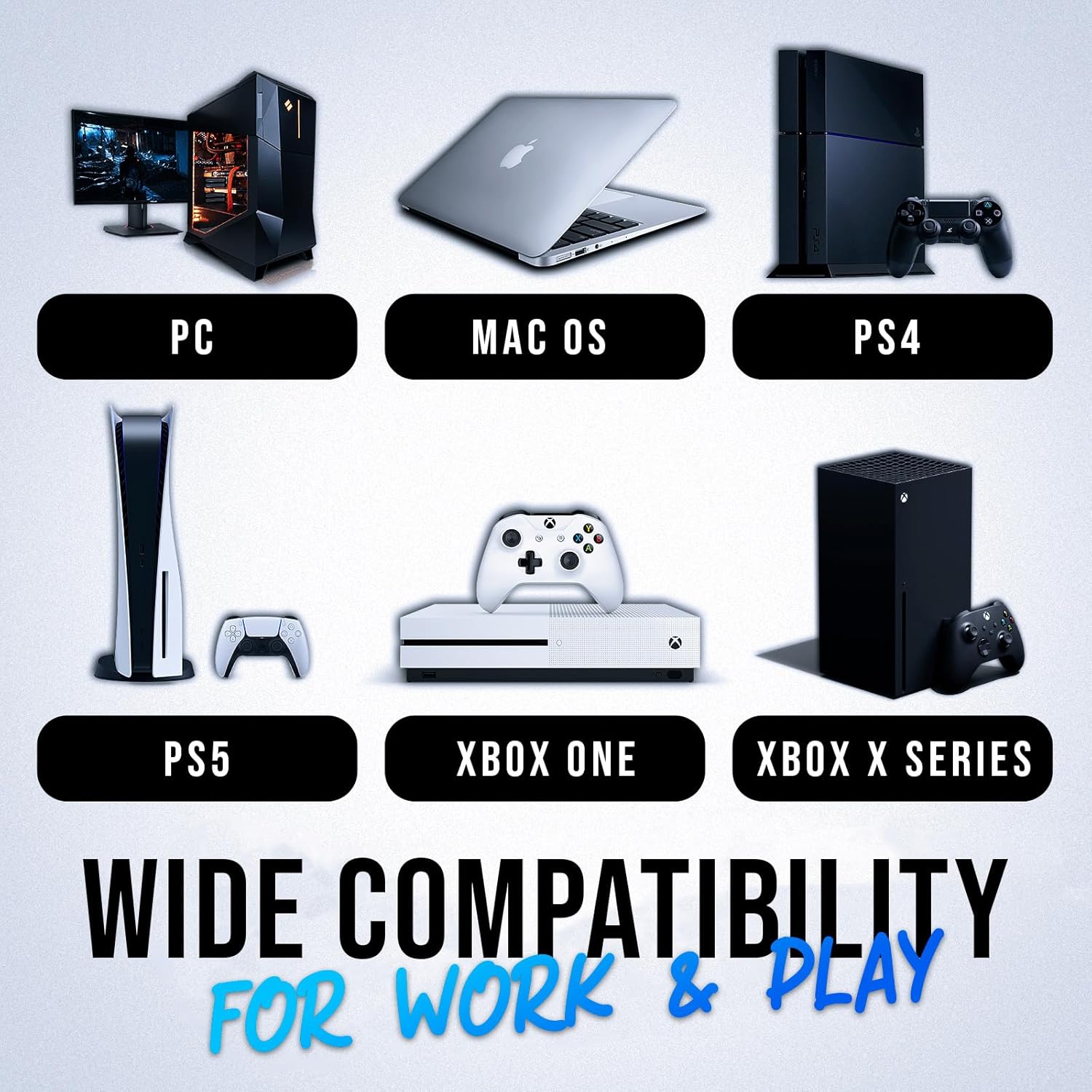Compatible devices Xbox, PS4/PS5 Connectivity technology Wireless Keyboard description Membrane Recommended uses for product Everyday Use, Gaming Special feature Backlit, Rechargeable, Water Resistant Colour Black Number of keys 105 Keyboard backlighting colour support RGB Style US