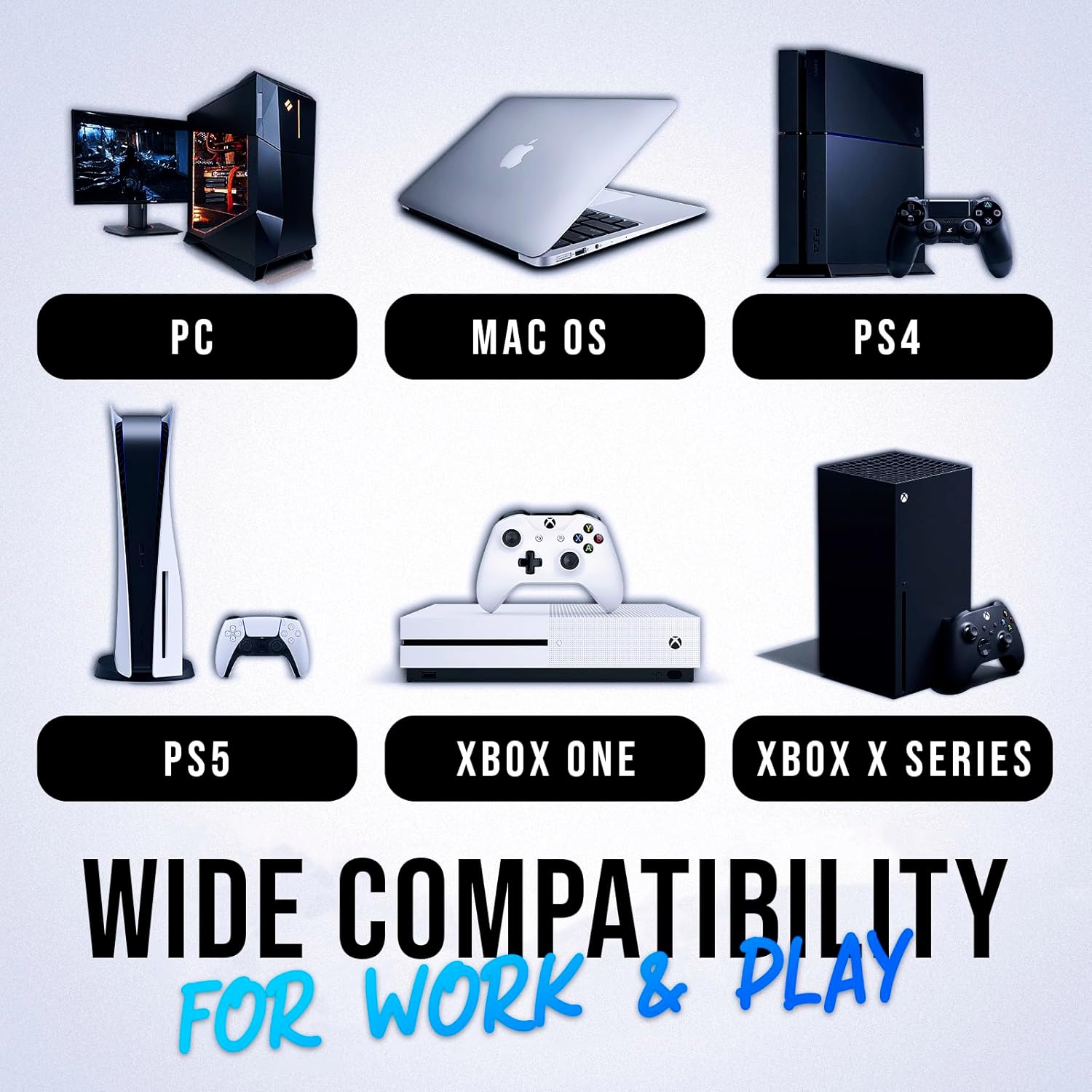 Features & SpecsCompatible Devices Xbox, PS4/PS5 Connectivity Technology Wireless Additional Features Backlit, Rechargeable, Water Resistant Number of Keys 105 Keyboard Backlighting Color Support RGB Number of Batteries Required 1 Power Source Battery Powered Switch Type Tactile Keyboard Layout QWERTY Hand Orientation Ambidextrous Button Quantity 104 Water Resistance Level Water Resistant Is Electric Yes StyleColour Black Style Name US Theme gaming
