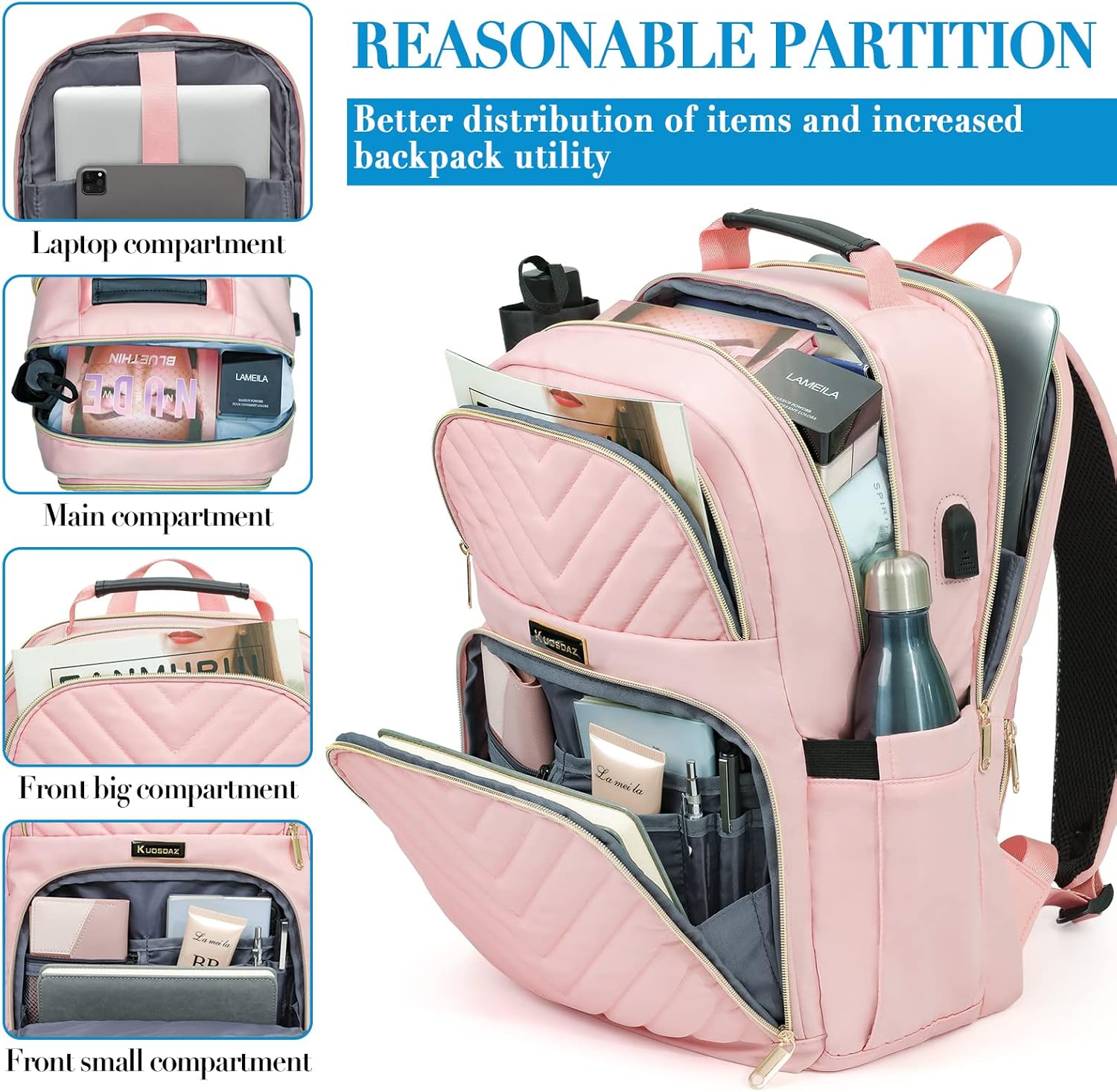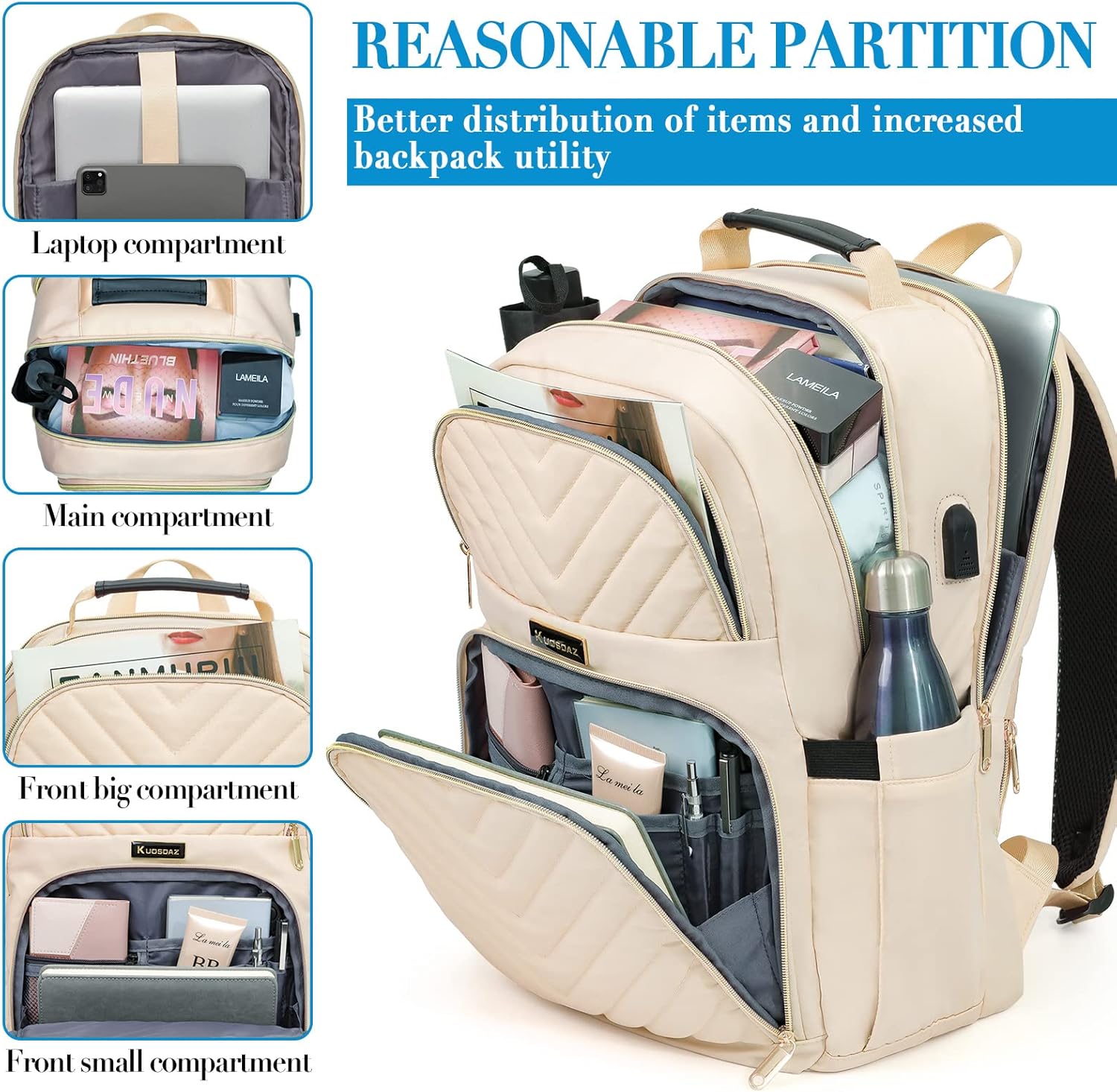 • Large Capacity Backpack with Laptop Compartment: The size of Kuosdaz laptop backpack for women is: 18.1*12.6*7 inch, 40L. The laptop backpack has a total of 4 compartments and 2 side pockets - 1 padded 15.6 inch laptop compartment. 1 main compartment inside for your folders, books, clothes, etc., as well as other daily necessities. 2 front pockets can hold pens, sunglasses, charger, keys. Travel school laptop backpacks keep everything organized.