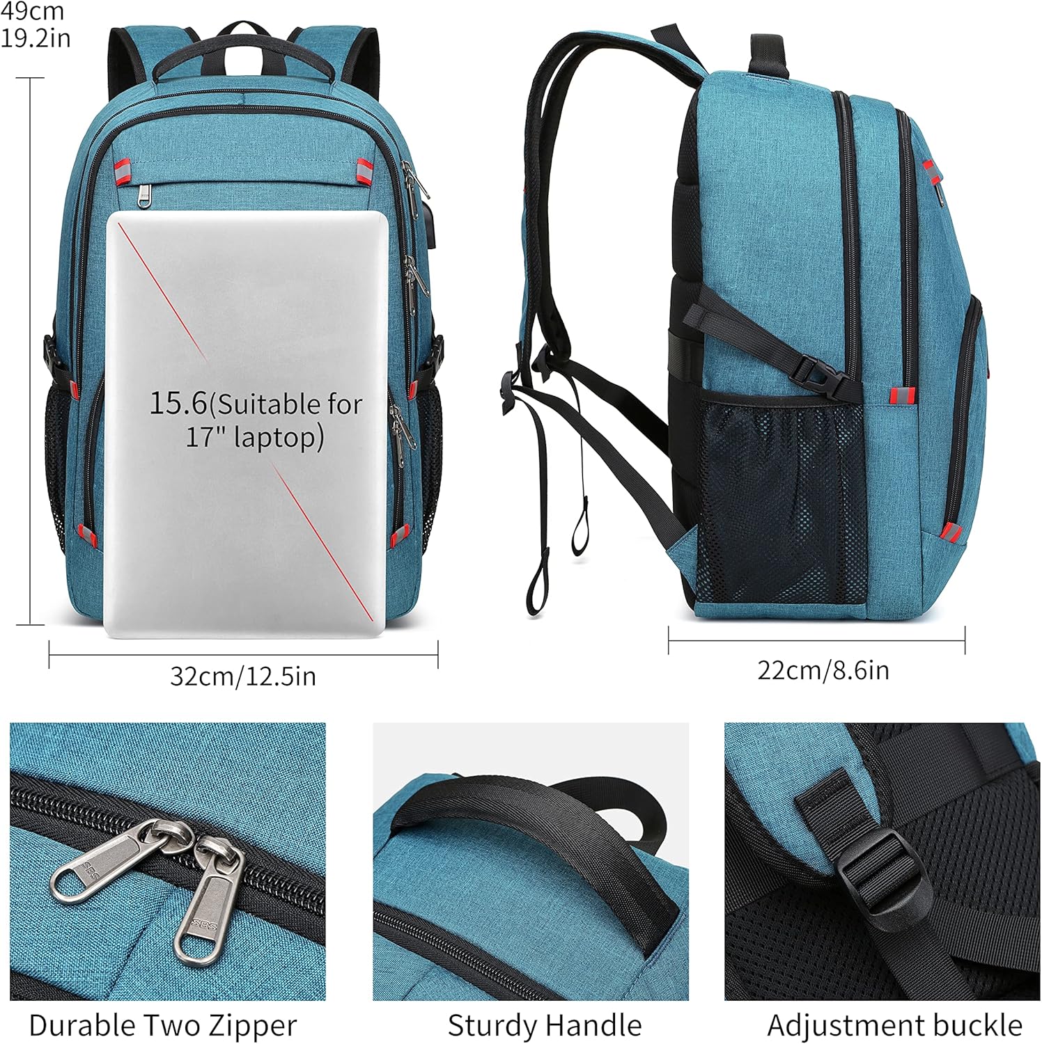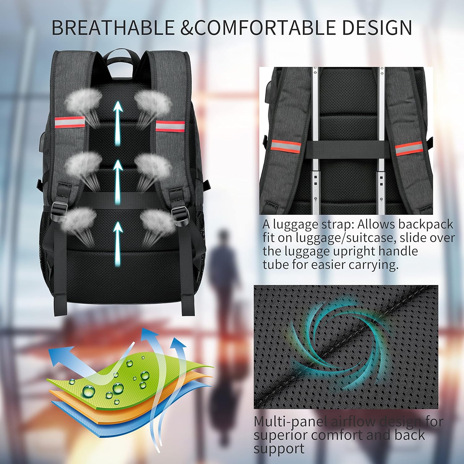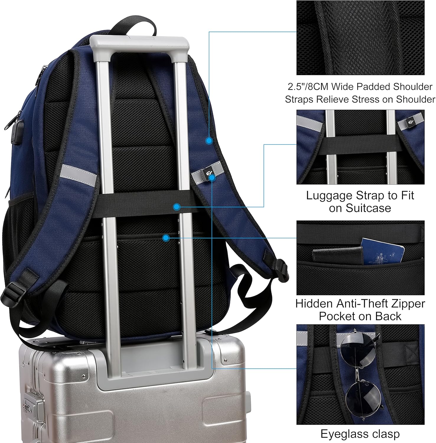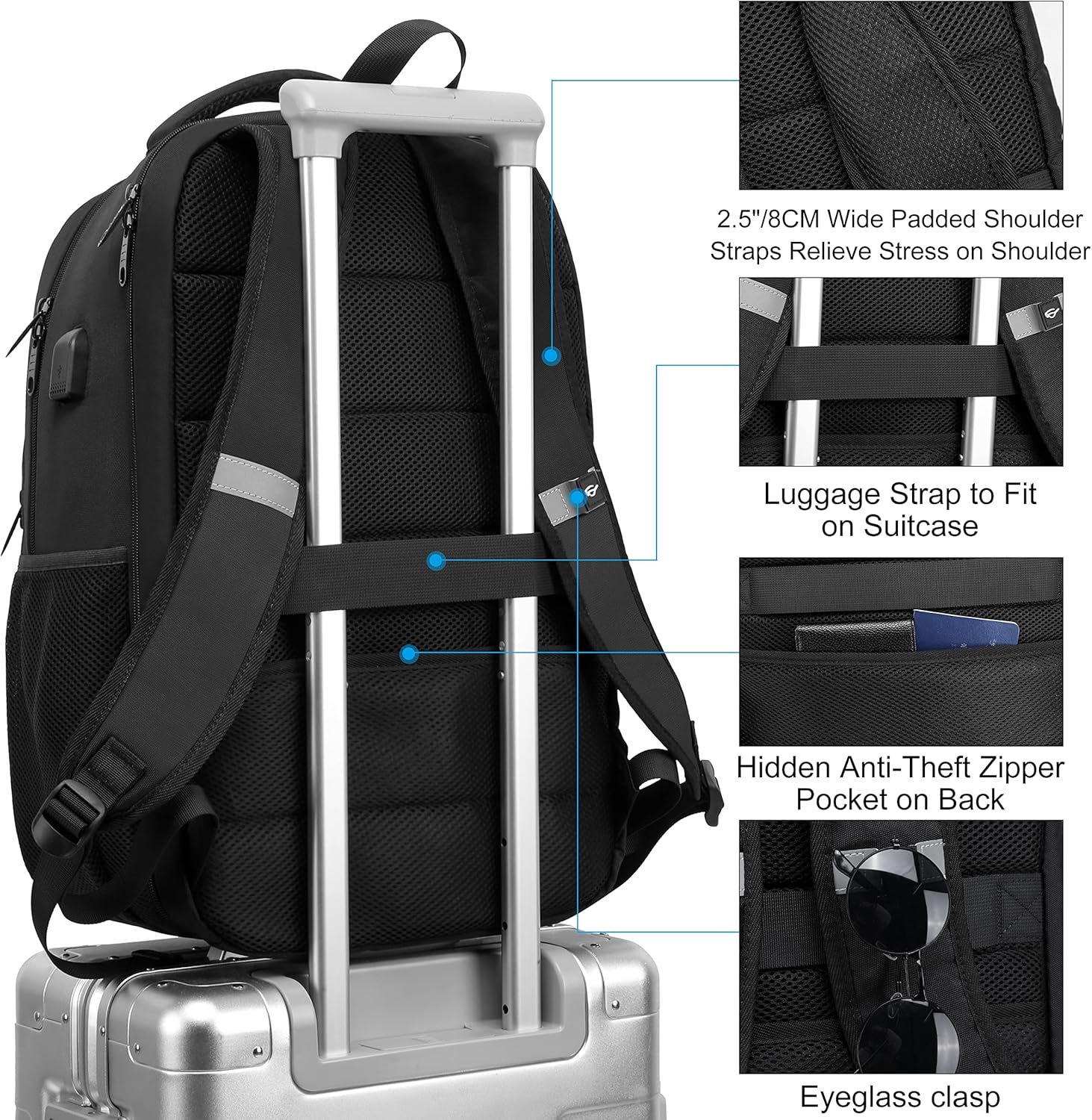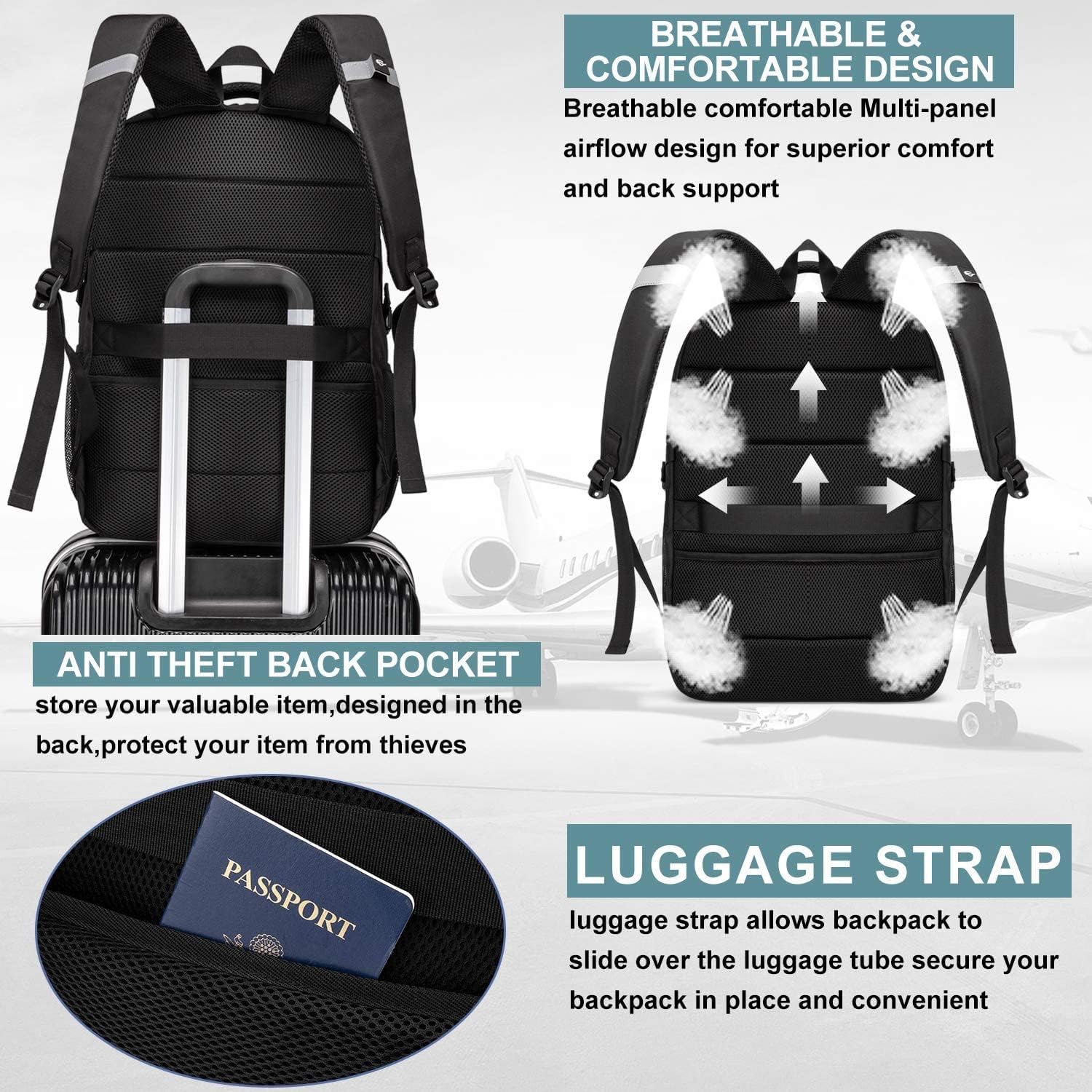Large Capacity: Soft lined laptop rucksack accommodates laptops less than 17 inch with enough enormous space. Good companion during your whole journey; Big enough so you can bring everything you need. Luggage Straps: A humane design with a drawbar sleeve on the rear, try to slide your backpack onto the luggage's puller to make your journey easy when you feel tired to carry backpack on your shoulders.Thicken shoulder straps combined with padded back cushion brings you a great comfort. Water-resistant: This backpack is waterproof splashing in daily using, but please do not use it for the rainy day and heavy rain. Comfortable Straps: Thicken shoulder straps combined with padded back cushion brings you a great comfort. Safety Design: The anti-stuck design zipper has its own keyhole. An RFID pocket with RFID function helps protect personal data encoded on your credit card, ID card and passport.You can lock the bag pack with anti-theft lock to protects your wallet and other valuables inside from thief. USB Port & Earphone Hole Design: Featuring earphone hole gives convenient access to earphone usage, built-in USB charging port offers a convenient charging of your electronic device anywhere. Perfect for business trips or weekend getaways or for simply heading to the office or school and home again. The external hook can easily hold your key-chain, water bottle,hat, glasses and other accessories. Application: Perfect for business trips travel hiking gaming or weekend getaways or for simply daily heading to the office or school and home again.