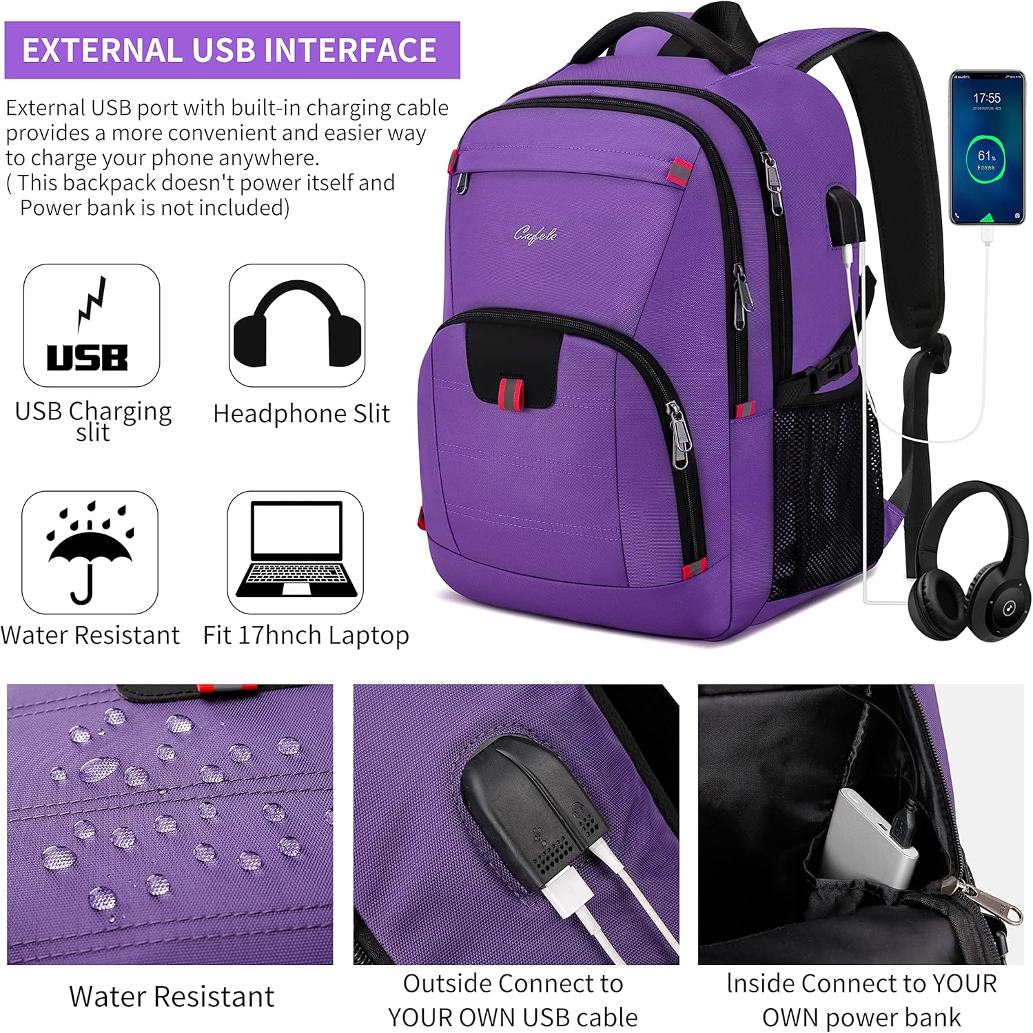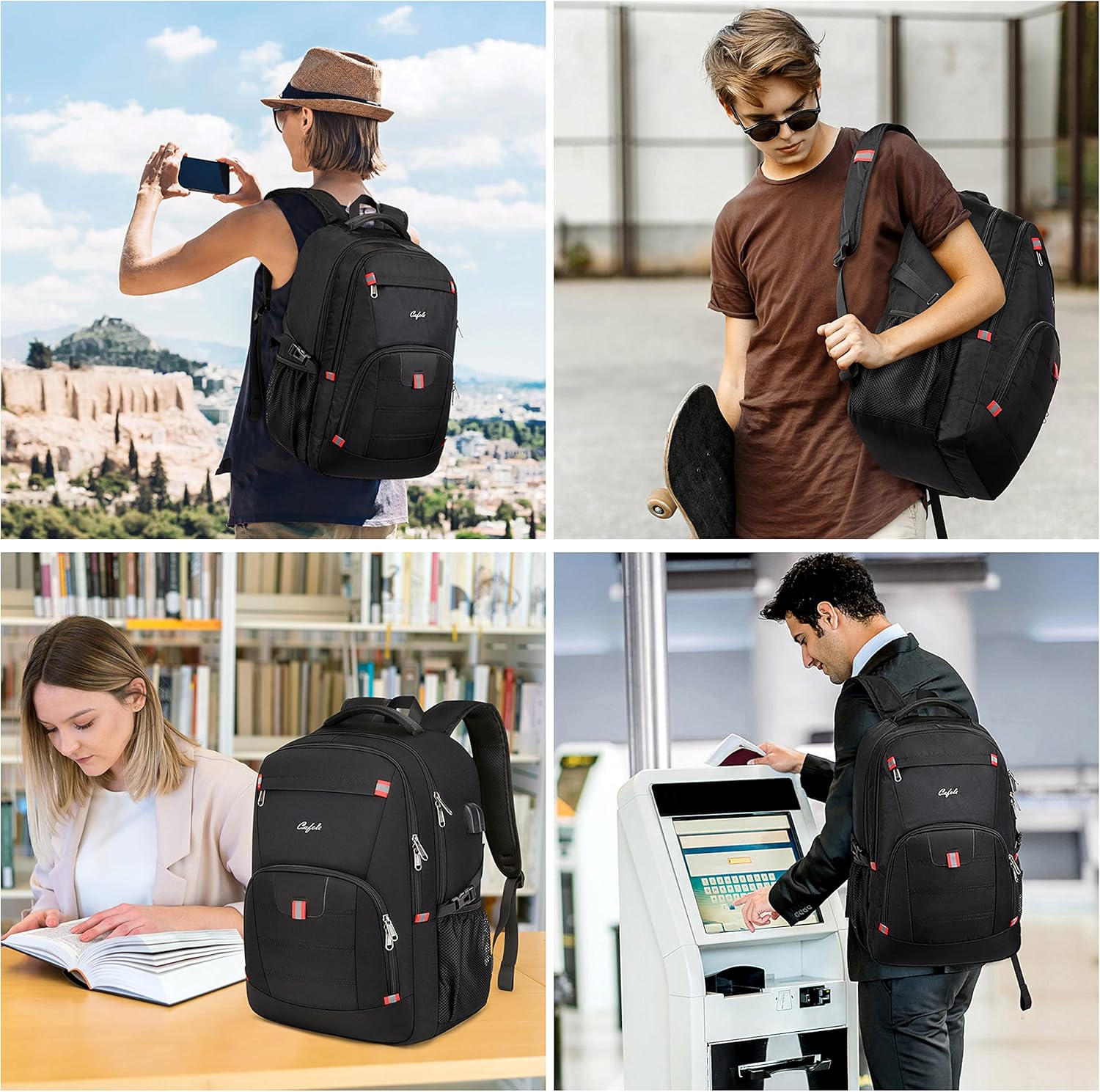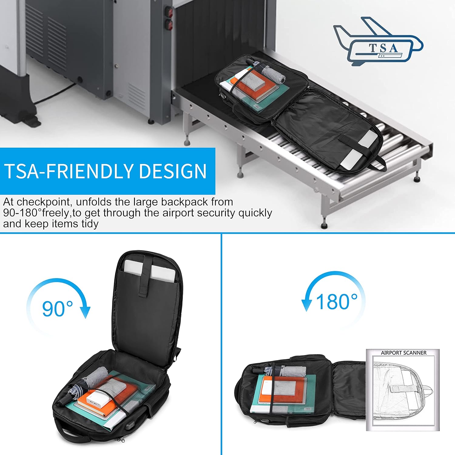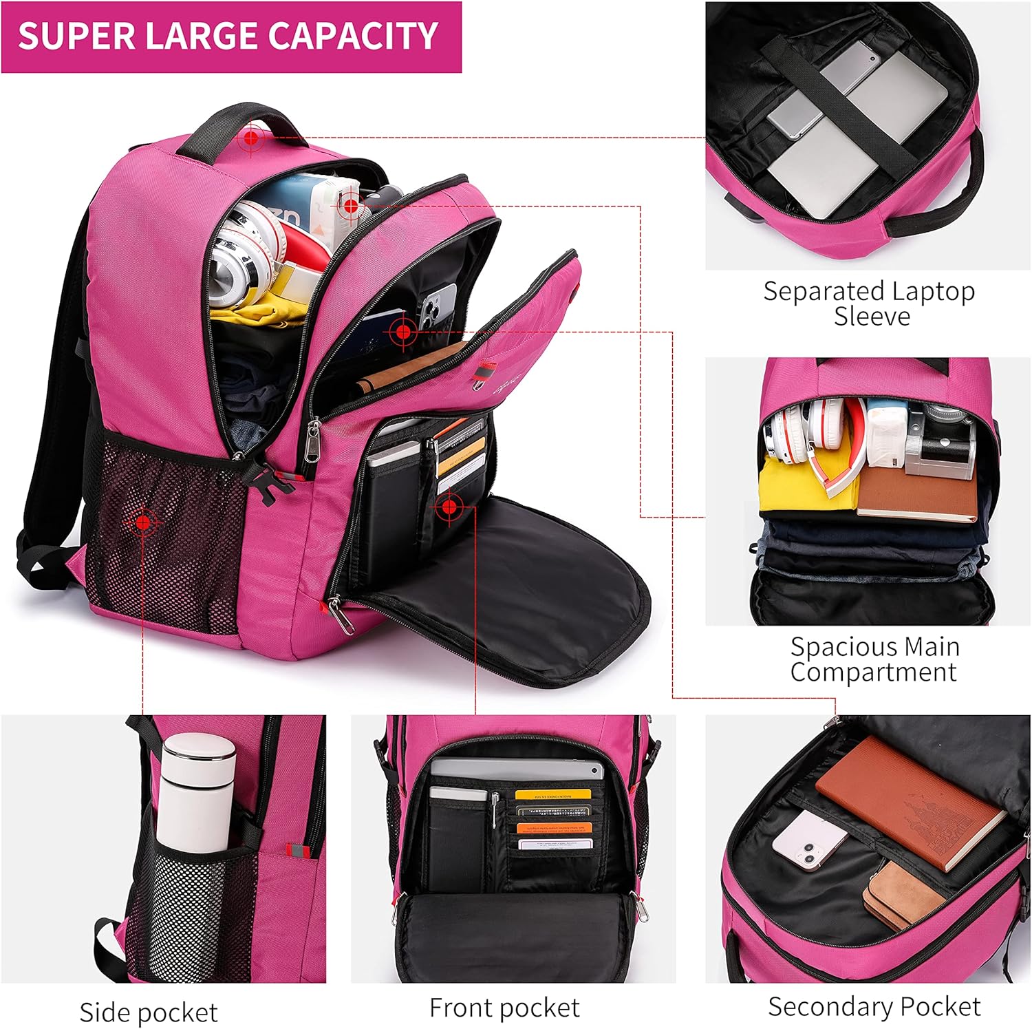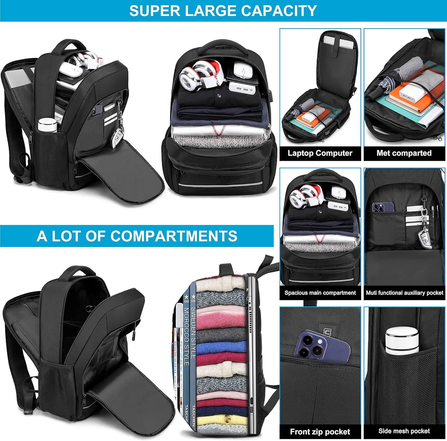 Large Capacity: Soft lined laptop rucksack accommodates laptops less than 17 inch with enough enormous space. Good companion during your whole journey; Big enough so you can bring everything you need. Luggage Straps: A humane design with a drawbar sleeve on the rear, try to slide your backpack onto the luggage's puller to make your journey easy when you feel tired to carry backpack on your shoulders.Thicken shoulder straps combined with padded back cushion brings you a great comfort. Water-resistant: This backpack is waterproof splashing in daily using, but please do not use it for the rainy day and heavy rain. Comfortable Straps: Thicken shoulder straps combined with padded back cushion brings you a great comfort. Safety Design: The anti-stuck design zipper has its own keyhole. An RFID pocket with RFID function helps protect personal data encoded on your credit card, ID card and passport.You can lock the bag pack with anti-theft lock to protects your wallet and other valuables inside from thief. USB Port & Earphone Hole Design: Featuring earphone hole gives convenient access to earphone usage, built-in USB charging port offers a convenient charging of your electronic device anywhere. Perfect for business trips or weekend getaways or for simply heading to the office or school and home again. The external hook can easily hold your key-chain, water bottle,hat, glasses and other accessories. Application: Perfect for business trips travel hiking gaming or weekend getaways or for simply daily heading to the office or school and home again.