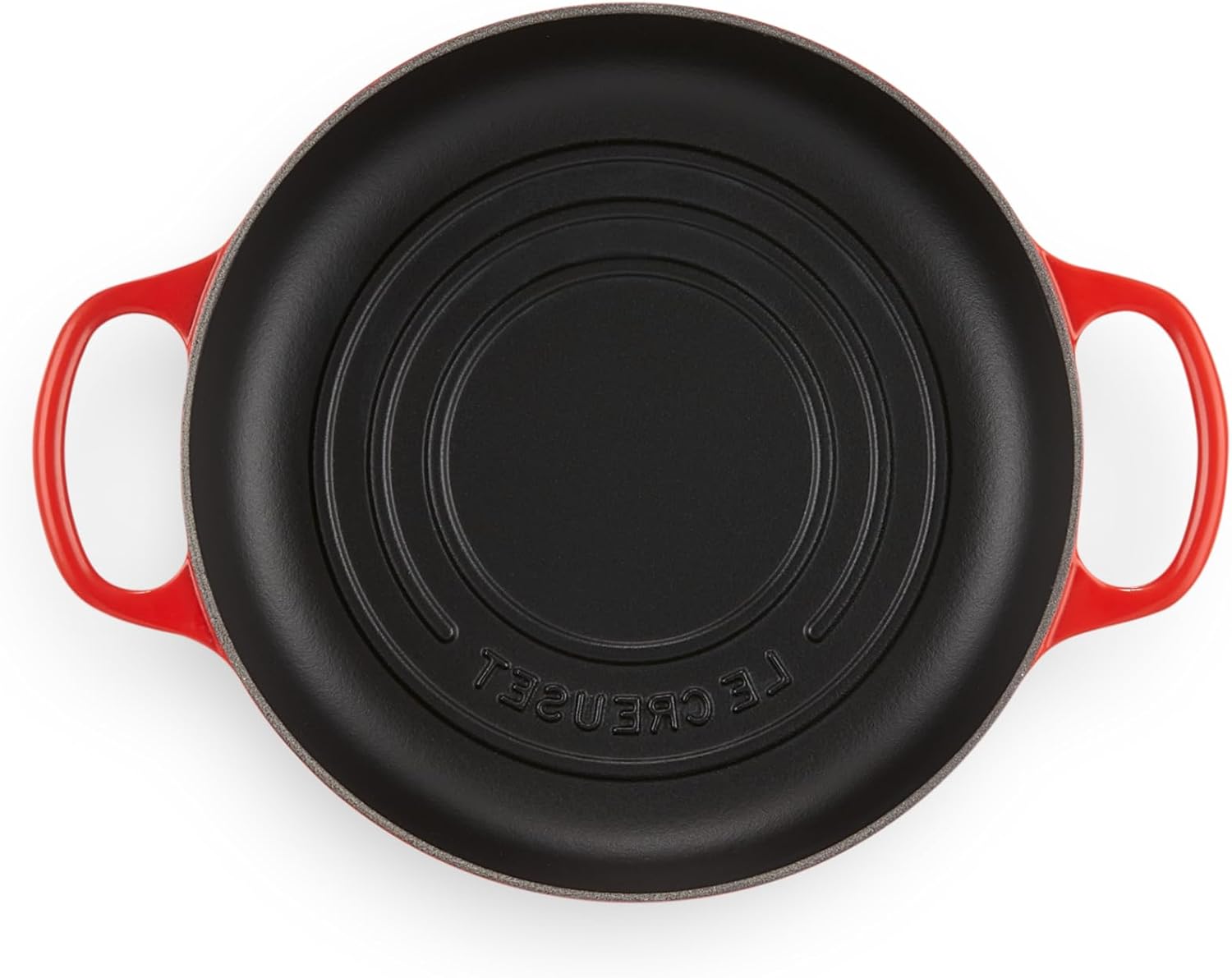 • Low-profile base has raised ridges for even browning and marks the loaf with the Le Creuset three rings