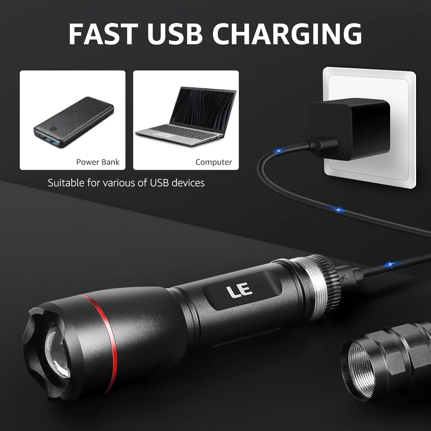 LE Rechargeable Flashlight, LED Flashlight 1000lm USB Tactical Flashlight Rechargeable Ultra Bright, Waterproof Flashlight with 5 Lighting Modes, Zoomable LED Torch Light for Camping, Running, Walking