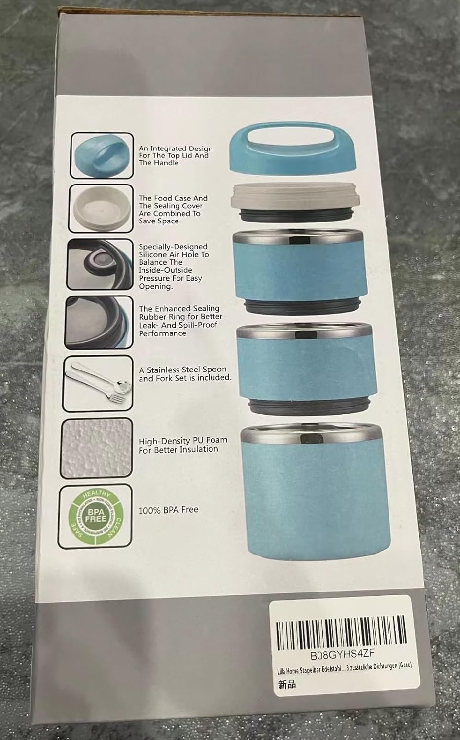 Lille Home Stackable Stainless Steel Thermal Compartment Lunch/Snack Box, 3-Tier Insulated Bento/Food Container with Lunch Bag, Cutlery Set and 3 Extra Seals, 43OZ (Gray)PL17-B08GYHS4ZF