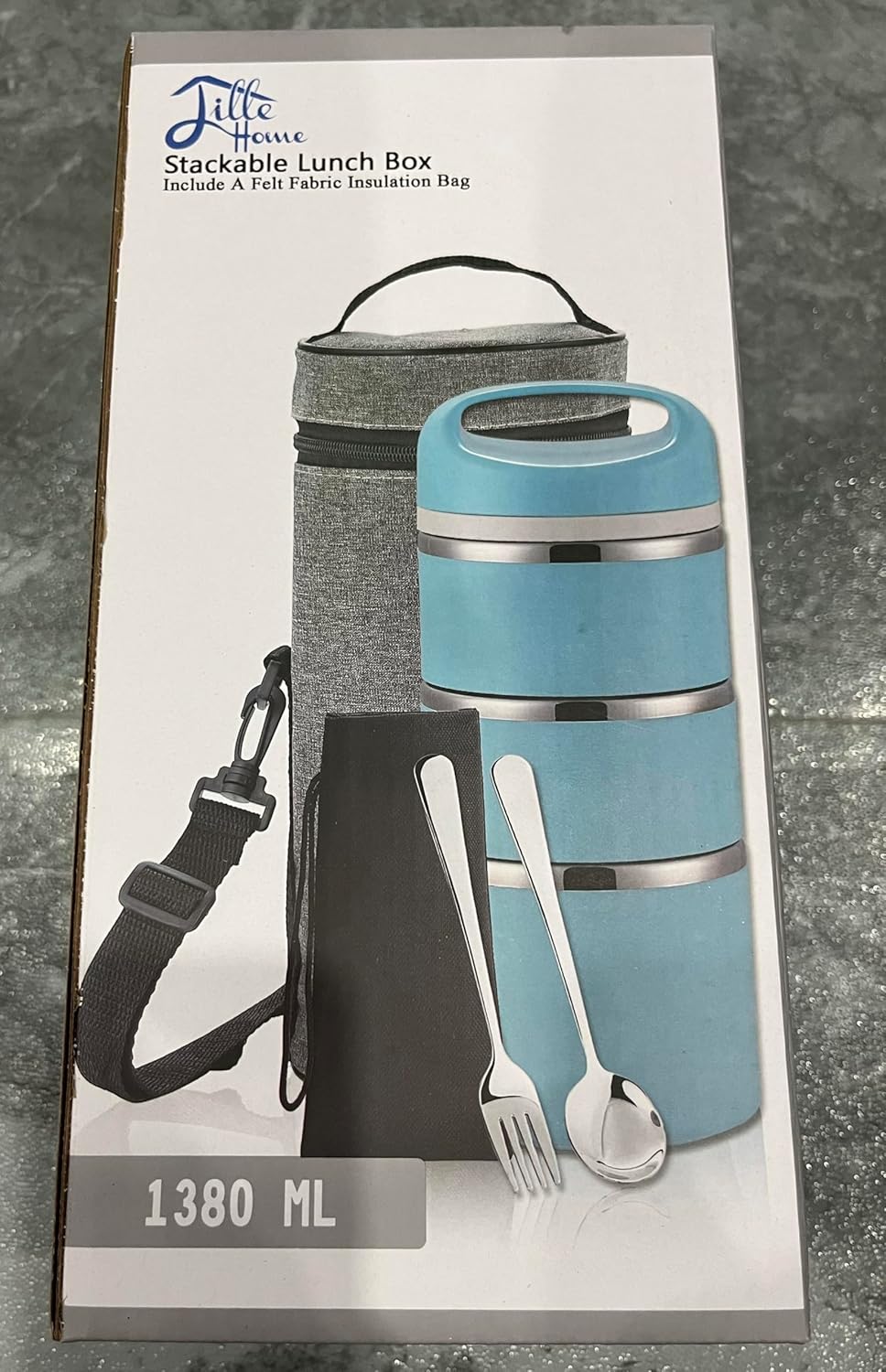 Lille Home Stackable Stainless Steel Thermal Compartment Lunch/Snack Box, 3-Tier Insulated Bento/Food Container with Lunch Bag, Cutlery Set and 3 Extra Seals, 43OZ (Gray)