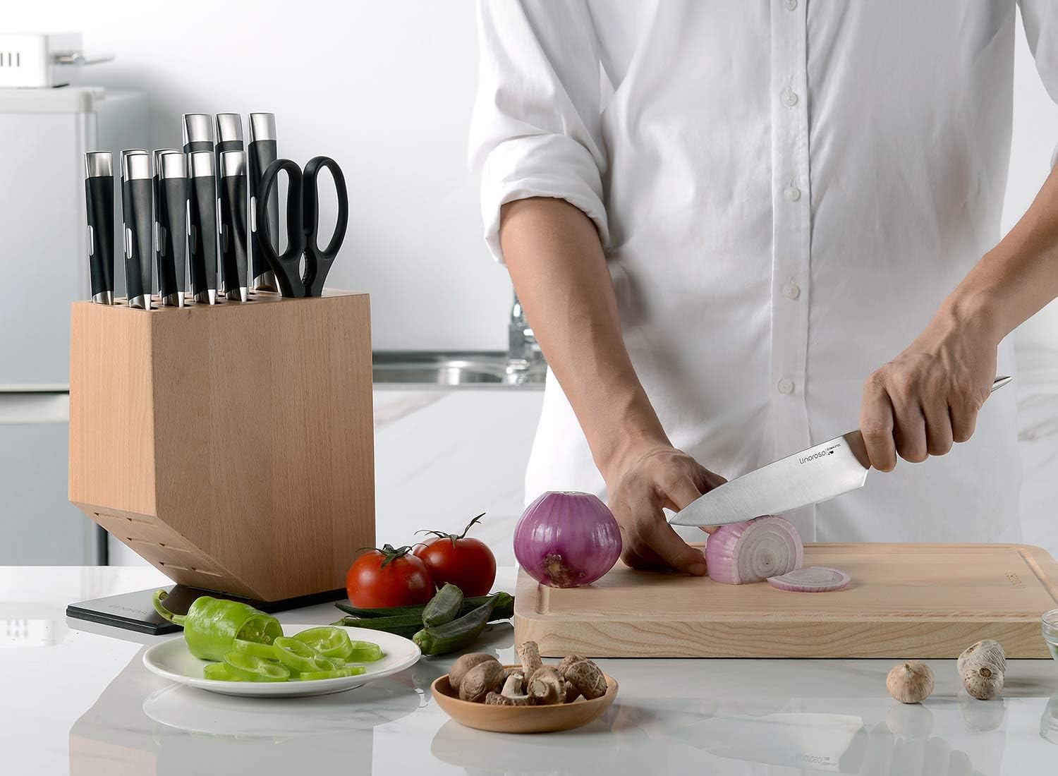 Linoroso Knife Set, 12-Piece Kitchen Knife Set with Block Sharp Chef Knife Set, German High Carbon Stainless Steel Knife Block Set with Beech Block with Black Oxide Stainless Steel Base