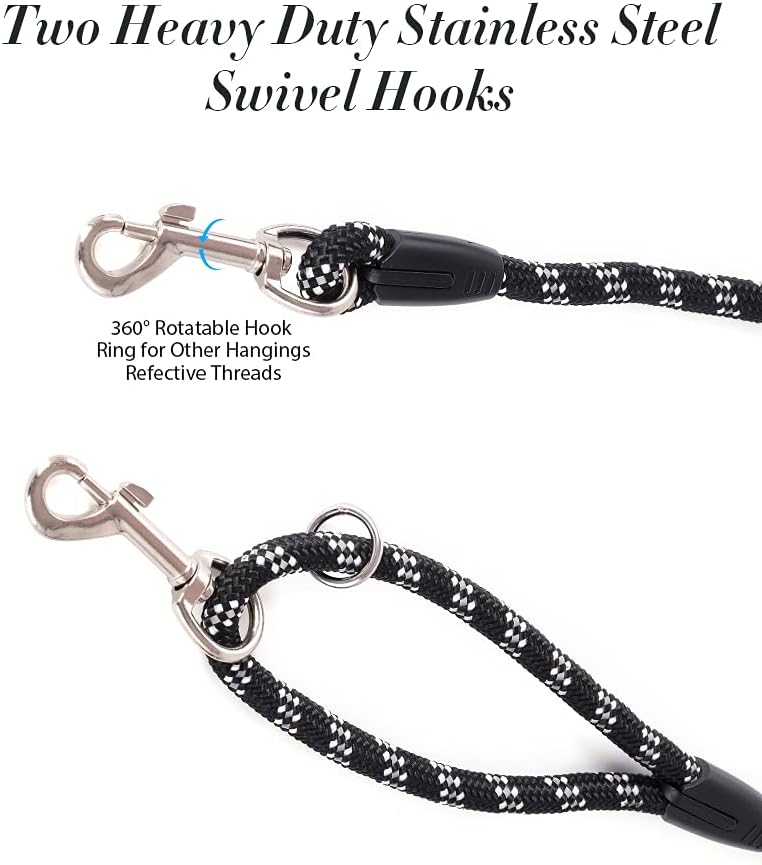 • Dog Tie Out Cable: Both ends of our rope dog leash leash have a heavy duty stainless steel swivel hook that can rotate 360 degree. You can tie one end of this training leash to your body or trees etc.,so that you can free your hands when traning, hiking,walking,etc.