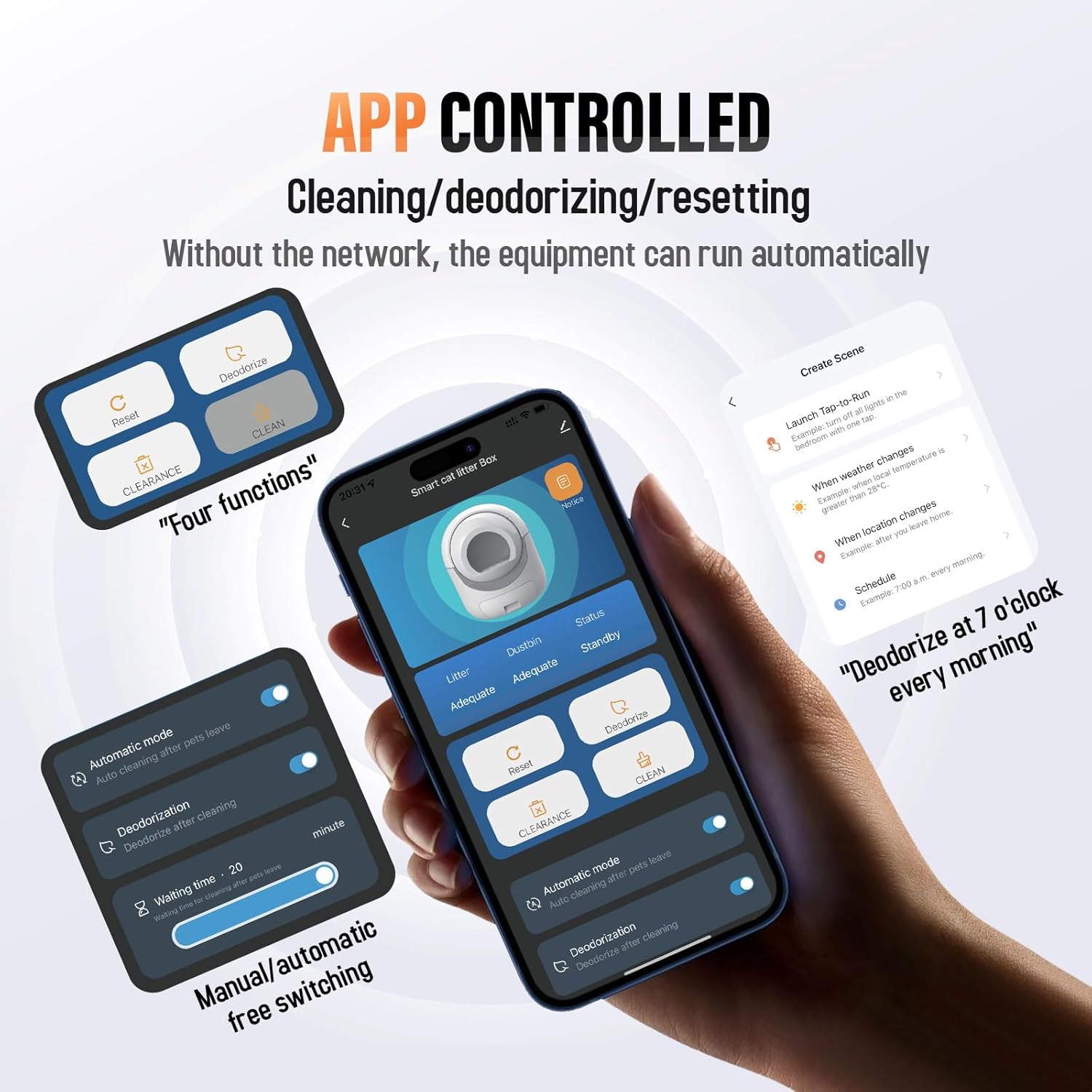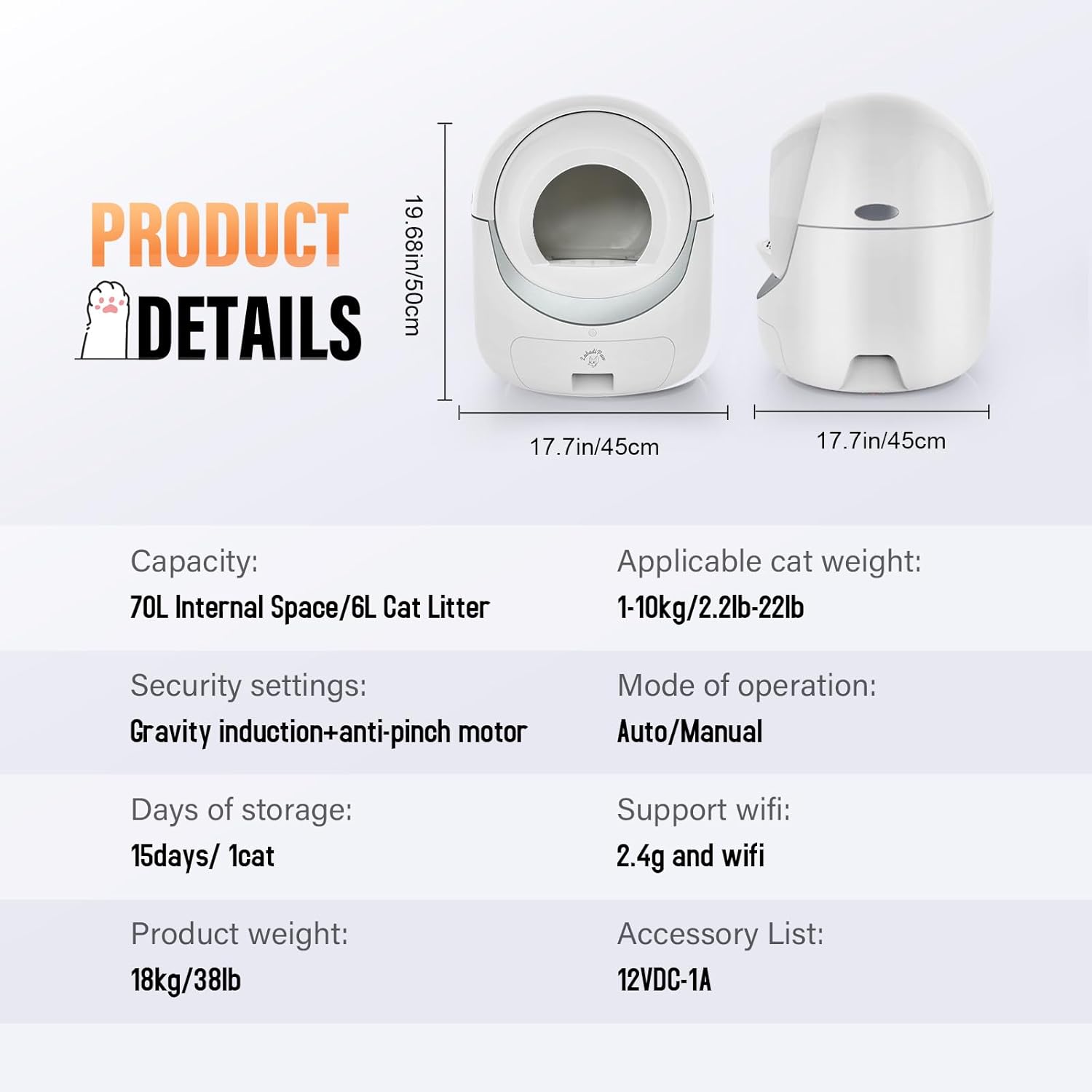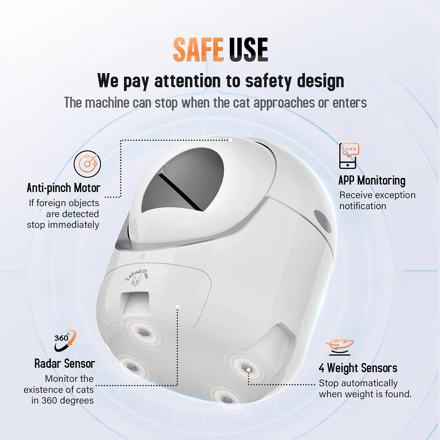 •  Safety First: The self-cleaning cat litter box Features sensors to detect your cat's presence and a delay mechanism to prevent the cleaning cycle from starting while your cat is inside, ensuring your feline friend's safety. Easy to set up and maintain with intuitive design and removable components for consistent hygiene