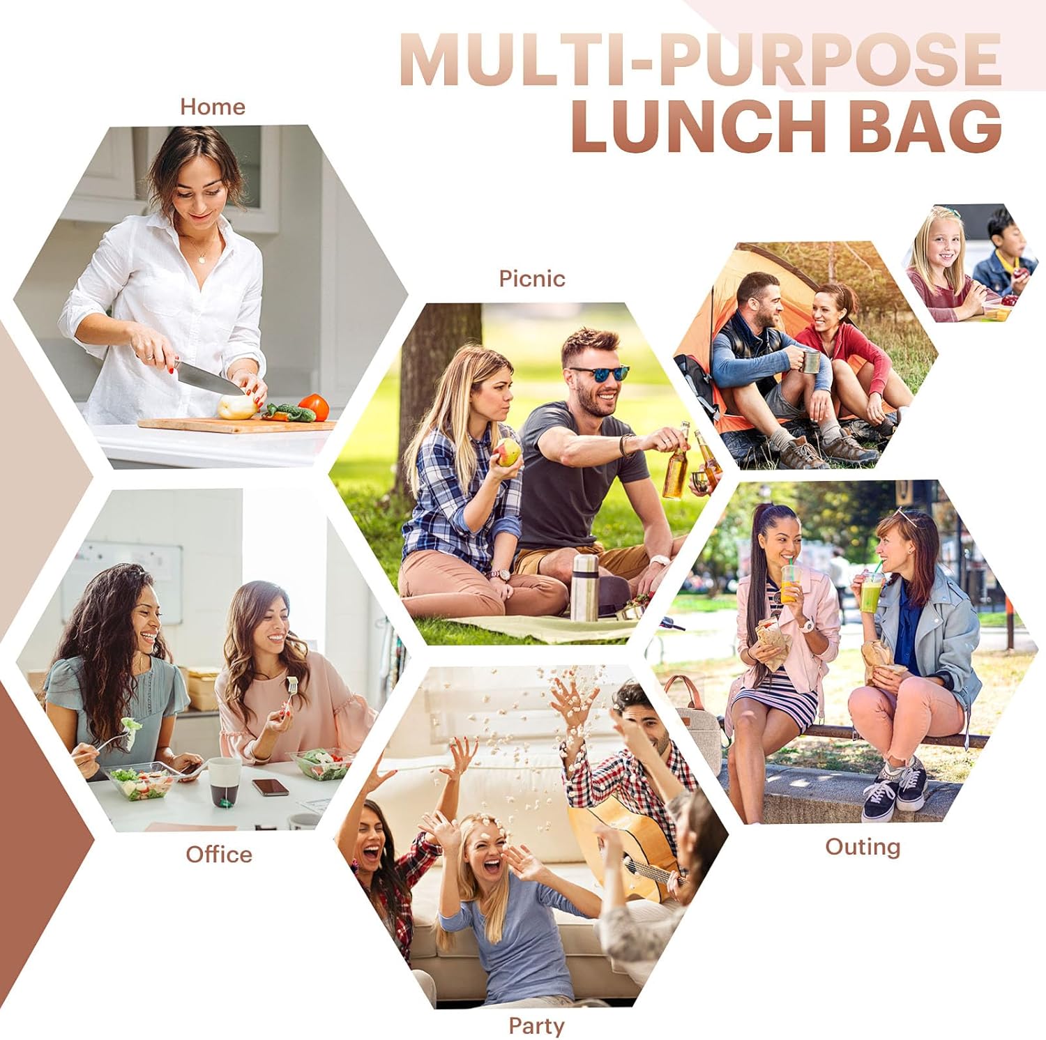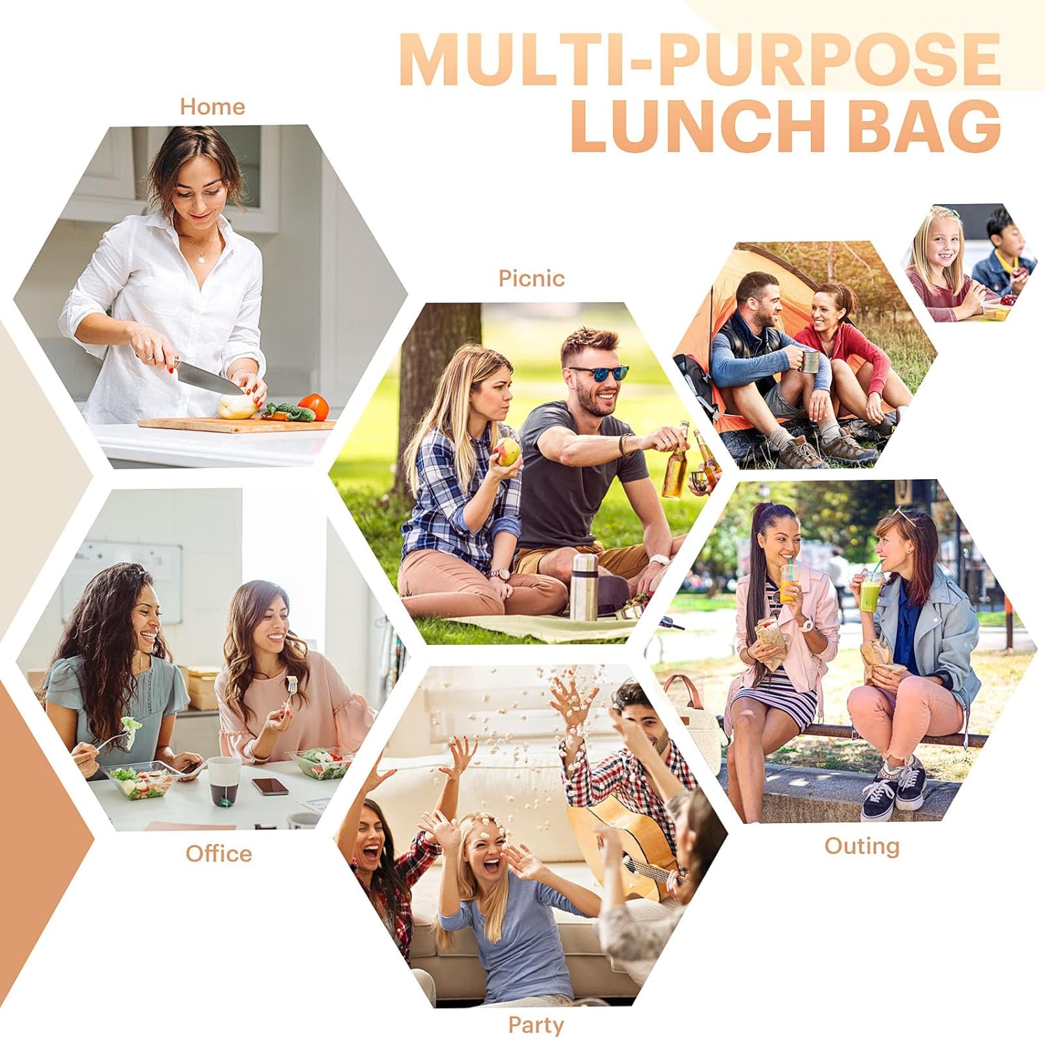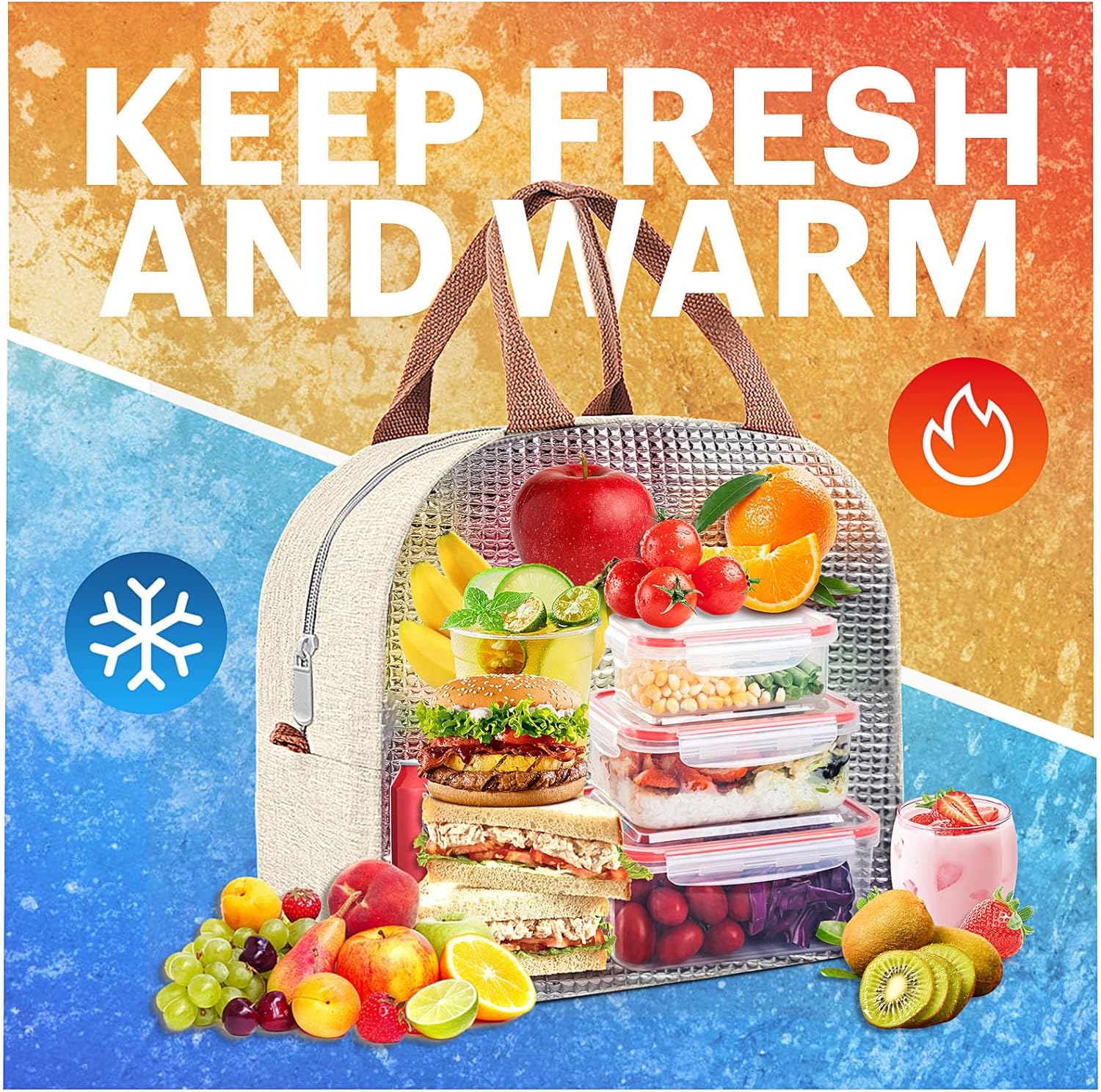 - ★MULTIFUNCTIONAL USE -- Our lunch tote is designed with versatility in mind. Featuring a heavy-duty handle made of durable linen material and advanced sewing technology, it can easily hold lunch boxes, fruits, and drinks all at once. Whether you're at the office, enjoying a picnic, traveling, or camping, our lunch tote allows you to enjoy warm food and cold drinks with ease.
