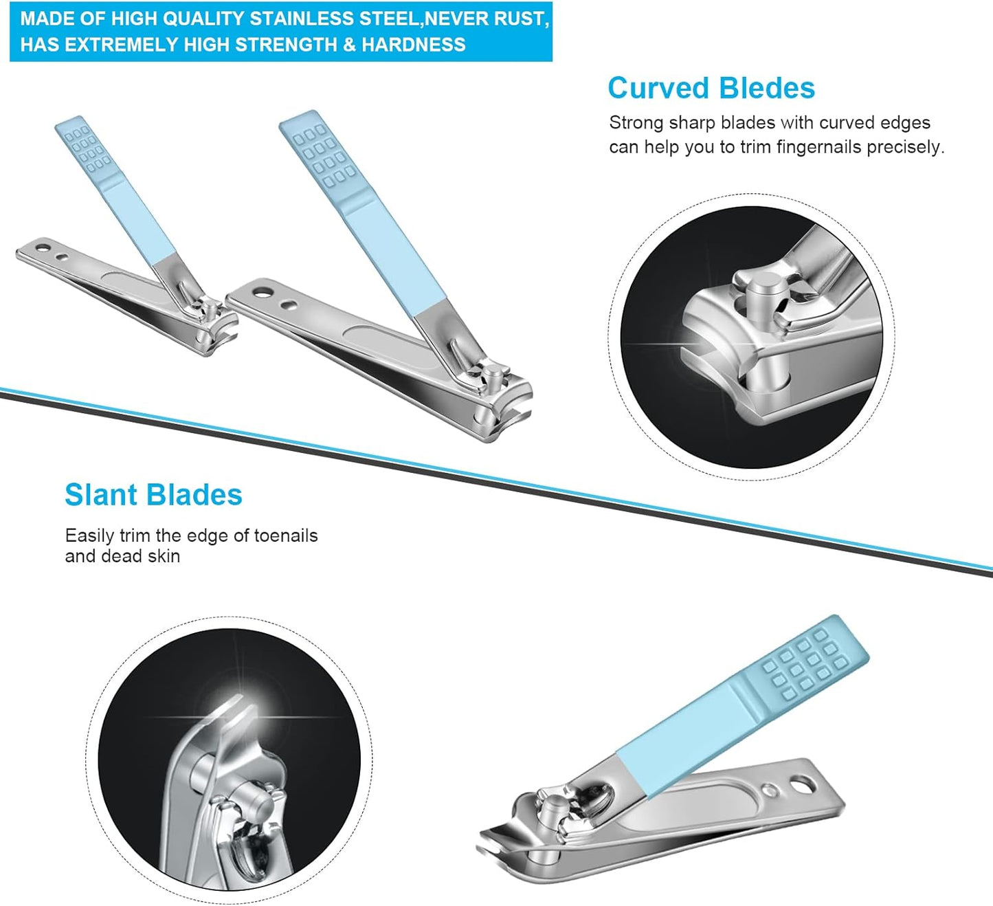 ♥【EXQUISITE TECHNOLOGY】WE CONTINUOUSLY IMPROVE PROCESSING TECHNOLOGY AND SERVICE. To make sure that it is sharp,durable, non-slip,anti-damage and never rust, all tools are made of high-quality 100% heavy-duty stainless steel with higher strength and hardness. Thick toenails and even wires can be easily cut off! Curved blade make the edge of nails smooth and not sharp after trimming.
