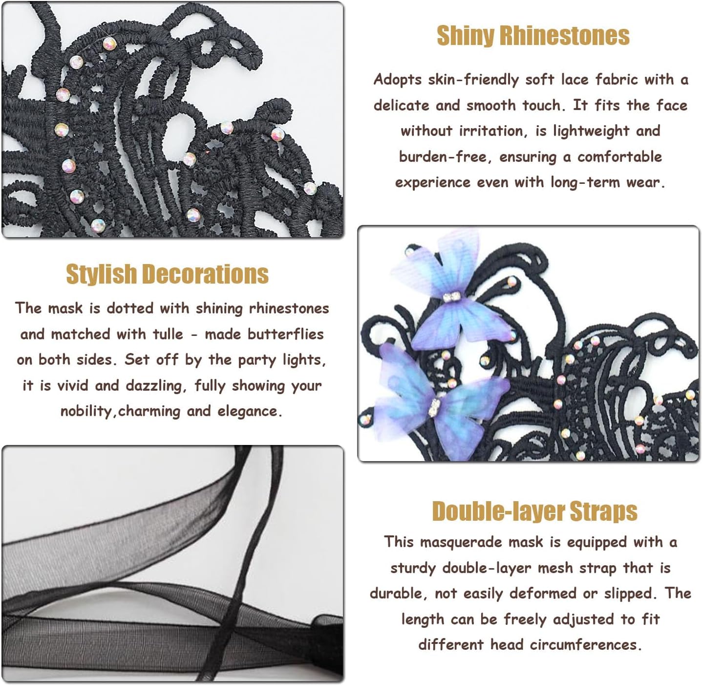 • ❤ Exquisite Decorations: The mask is dotted with shining rhinestones and matched with tulle - made butterflies on both sides. Set off by the party lights, it is vivid and dazzling, fully showing your nobility,charming and elegance.