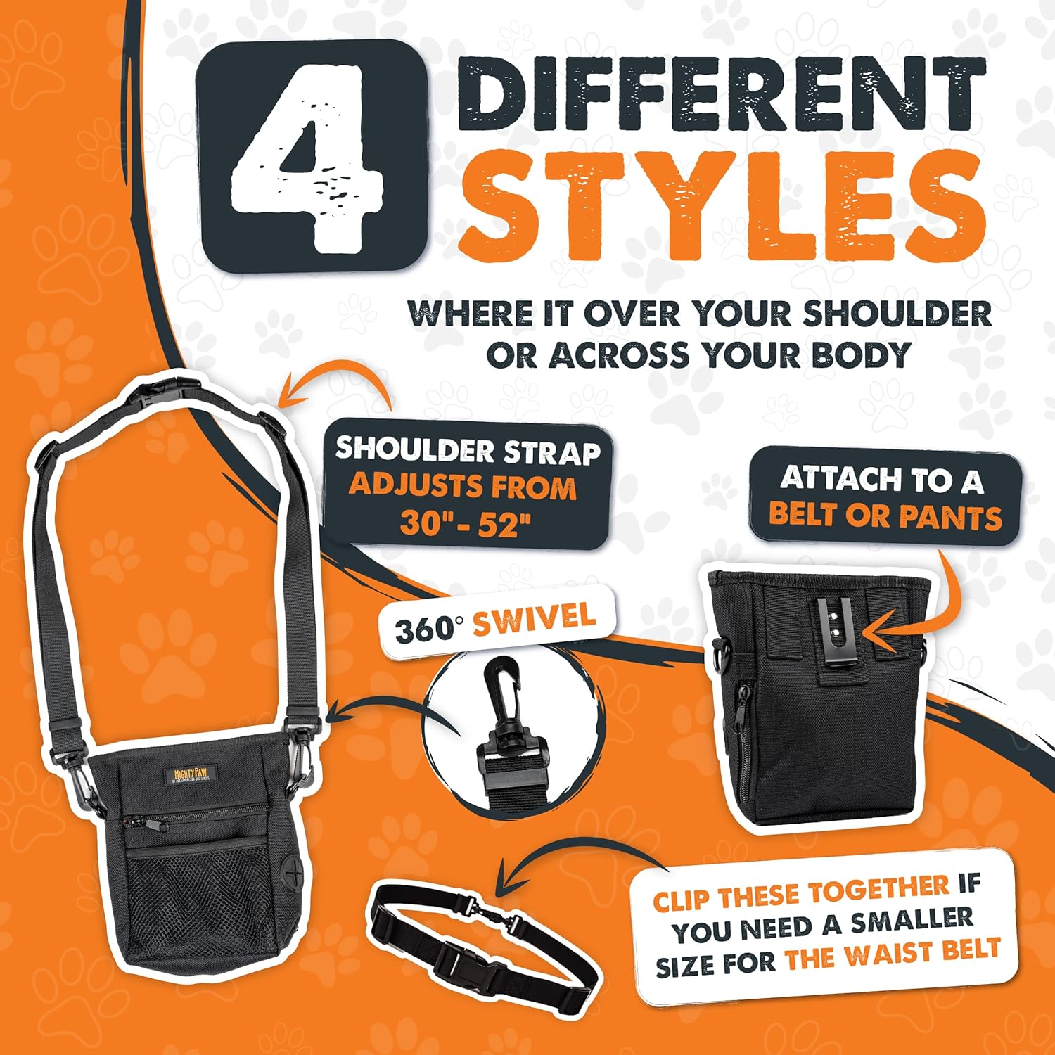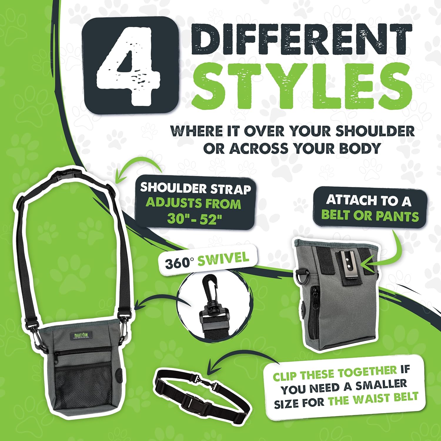 - Ultimate Versatility: We designed our treat pouch 2.0 with a multi-purpose belt sling and a metal clip. You can wear it 4 different ways: Over the shoulder or across your body using the shoulder strap that adjusts from 30”-52”, around your waist by looping the adjustable belt sling onto the 2 attachment points, or on your belt or pants by attaching the metal clip accordingly.