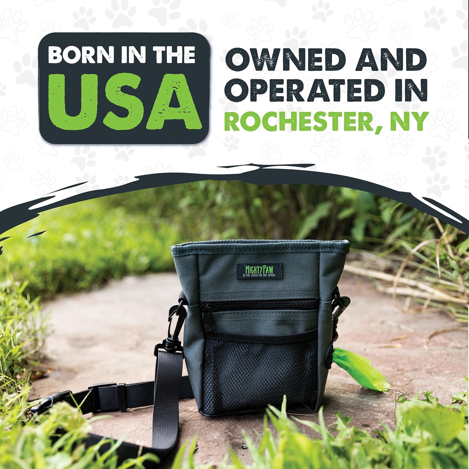 Mighty Paw Dog Treat Pouch 2.0 | Pet Training Hands-Free Snack Bag w/Strap. Holds 2 Cups Kibble, Phone & Keys. Magnetic Clasp & Waist Belt Clip. Includes 1 Roll of Poop Bags (Green/Grey)