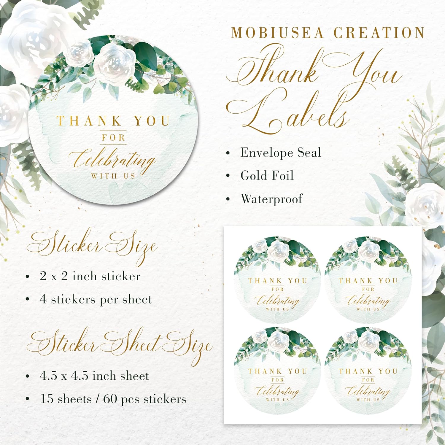 Mobiusea Creation White Floral Thank You for Celebrating with us Stickers | 2 inch | Gold Foil | 60pcs Waterproof Thank You Stickers Wedding Labels for Wedding, Bridal Shower, Baby Shower