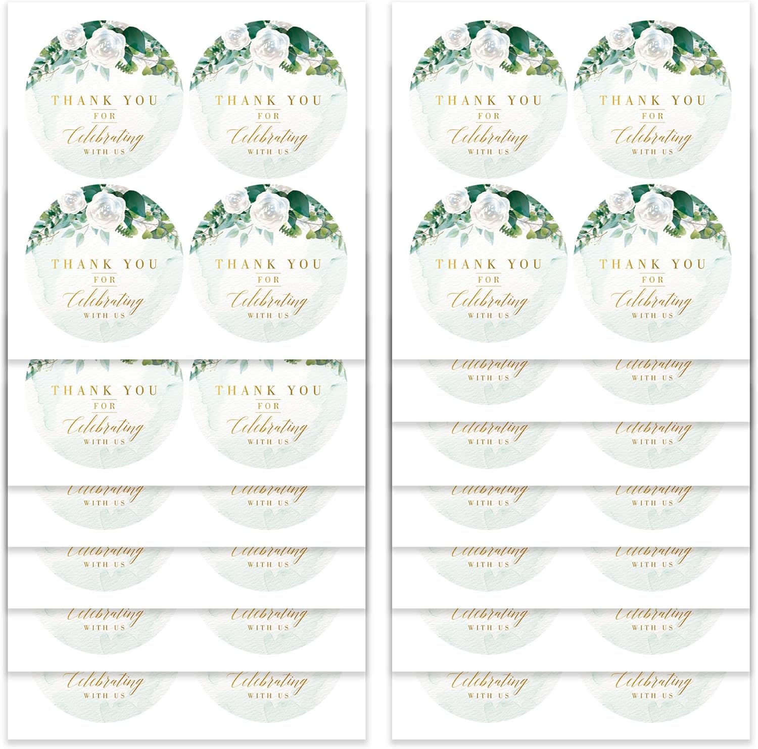 - Quantity and Size - 60pcs waterproof thank you for celebrating with us stickers in a set. 2" in diameter. This is the easy-match and cost-efficient way to impress your guests.