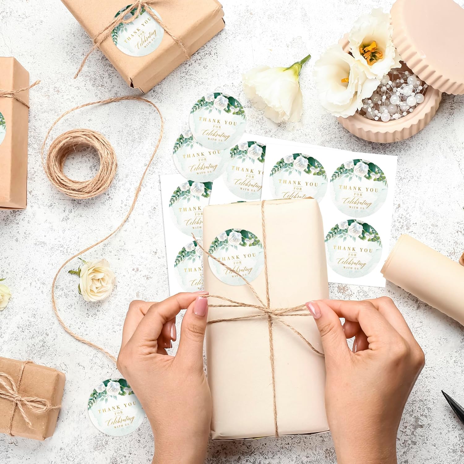 - Chic and Elegant - Romantic white floral with stunning gold foil script thank you for celebrating with us sticker design, impressed your guests with these beautiful thank you stickers. A great fit for your party gift tags, wedding favor bag, and thanks label sticker.