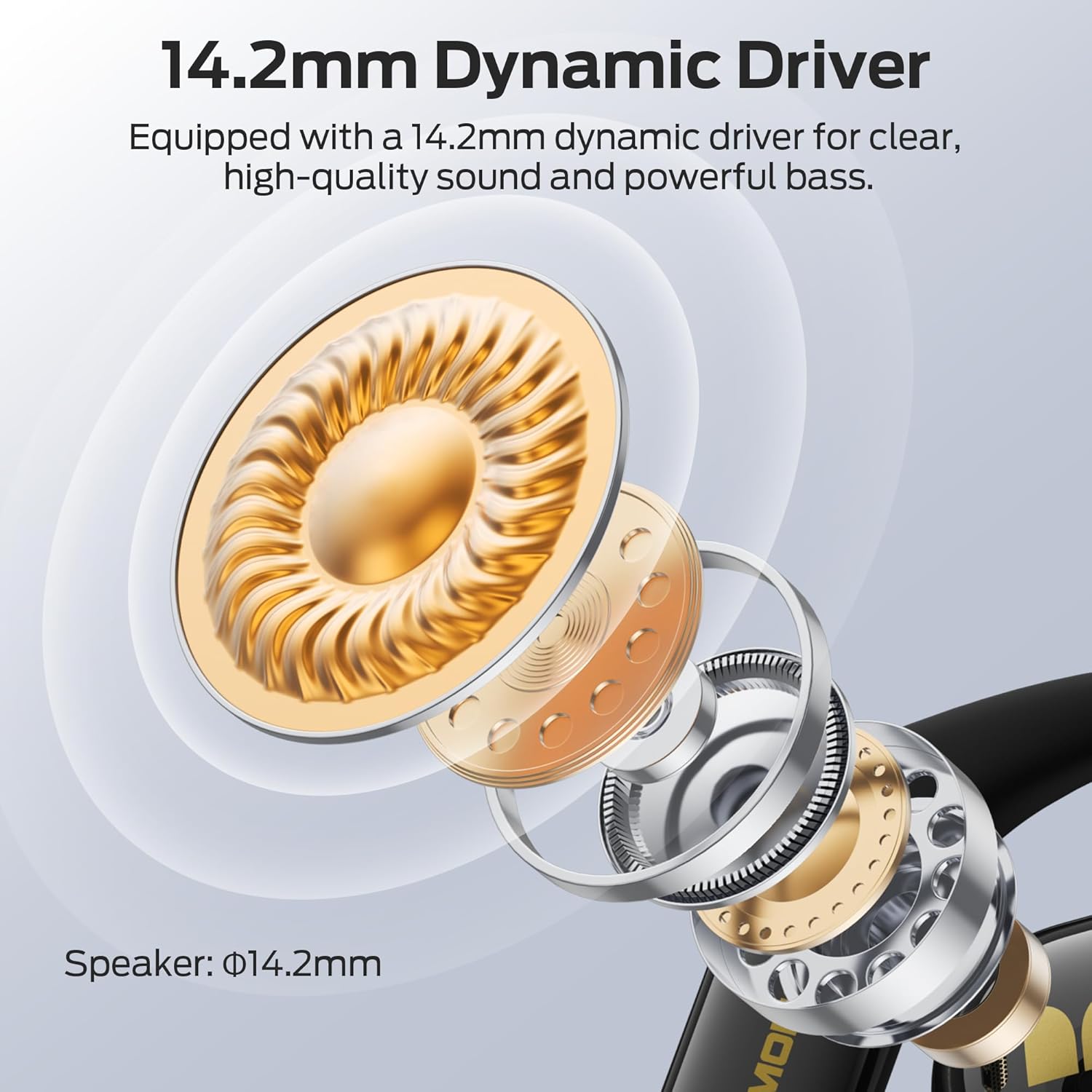 • 【 Premium Sound Quality 】 A 14.2mm dynamic driver delivers immersive sound with deep bass and crisp highs. Professionally tuned to reduce distortion, the headphones also feature dual noise-reducing microphones for crystal-clear calls, even in loud or busy environments.