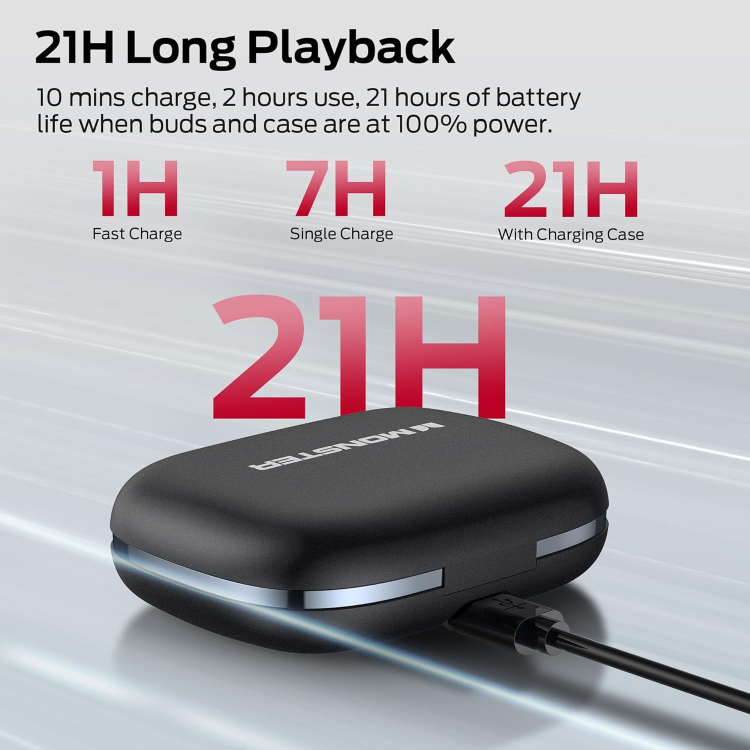 - 【21H Long Playtime and Fast Charge】Monster open ear headphones deliver up to 7 hours of playtime on a single charge (at 50-60% volume). The compact charging case provides 21 hours of total battery life, keeping your music going nonstop. Featuring USB-C fast charging, just 10 minutes of charging gives you 1 hour of playback—so you can power up quickly and get back to your day.