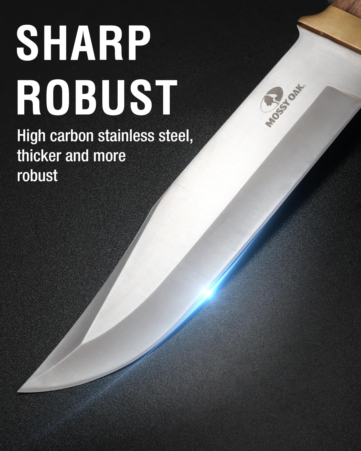 MOSSY OAK 14-inch Bowie Knife, Full-tang Fixed Blade Wood Handle with Leather Sheath for Camping Survival