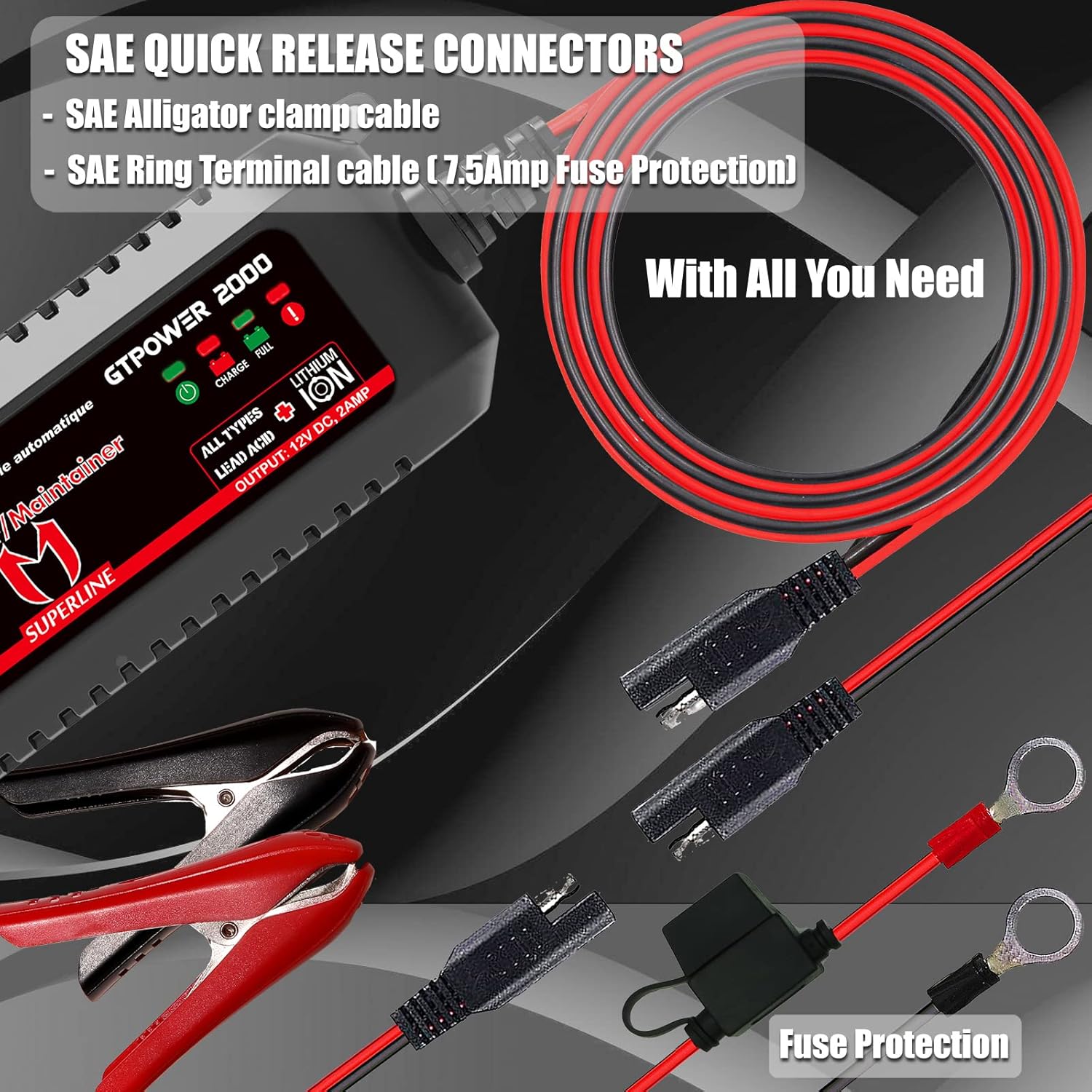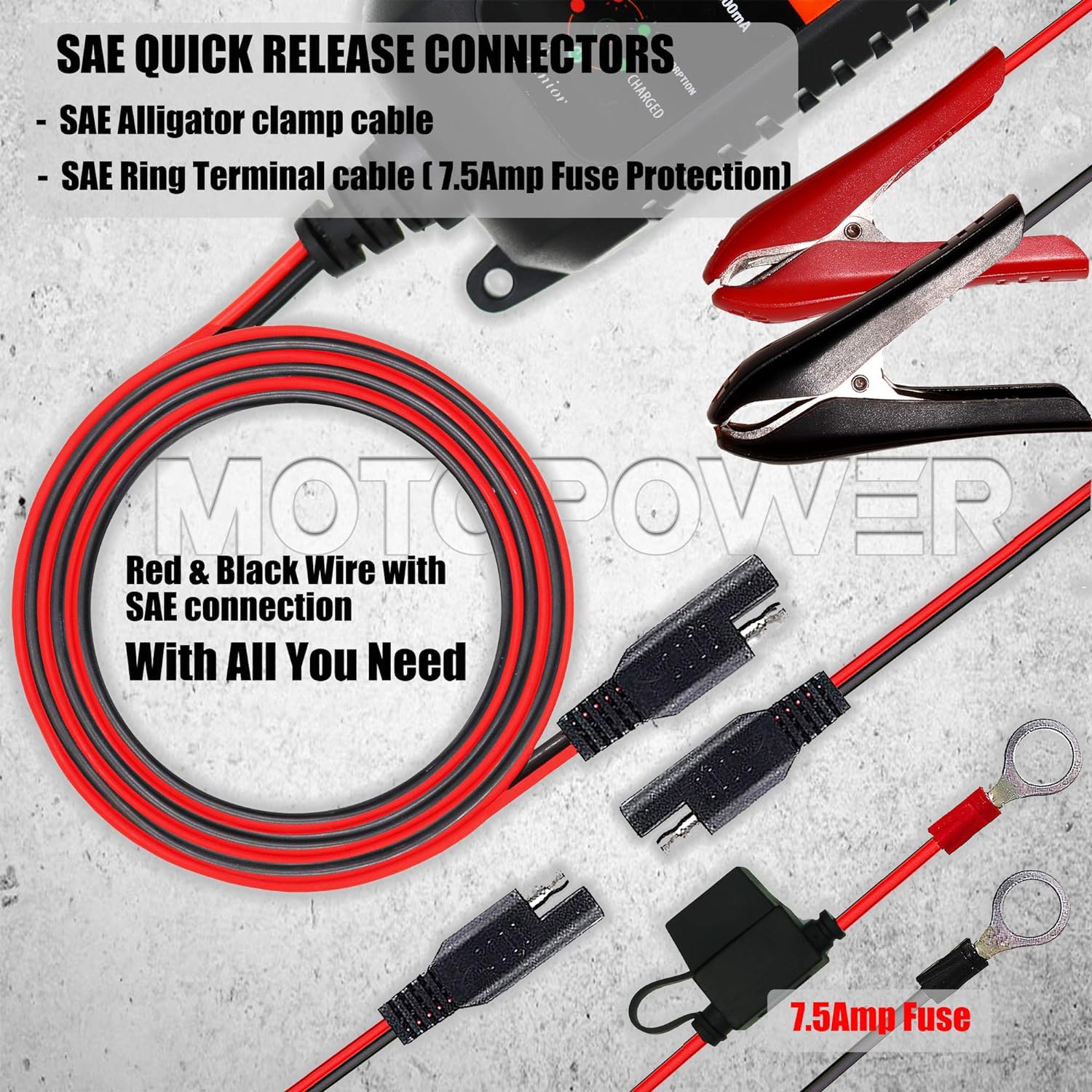 SAE Quick Release Adapters - With SAE quick release connection options: Ring Terminals (7.5amp fused for safety protection) or Alligator Clips. With the ring terminal harness connecting with the battery permanently, it's so easy to connect the charger by the SAE adapters when needed. Fuse protection will avoid danger of short circuit or overload.
