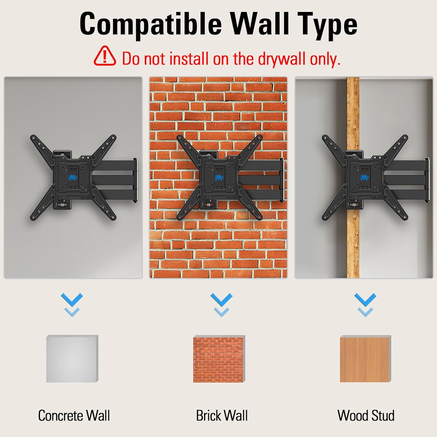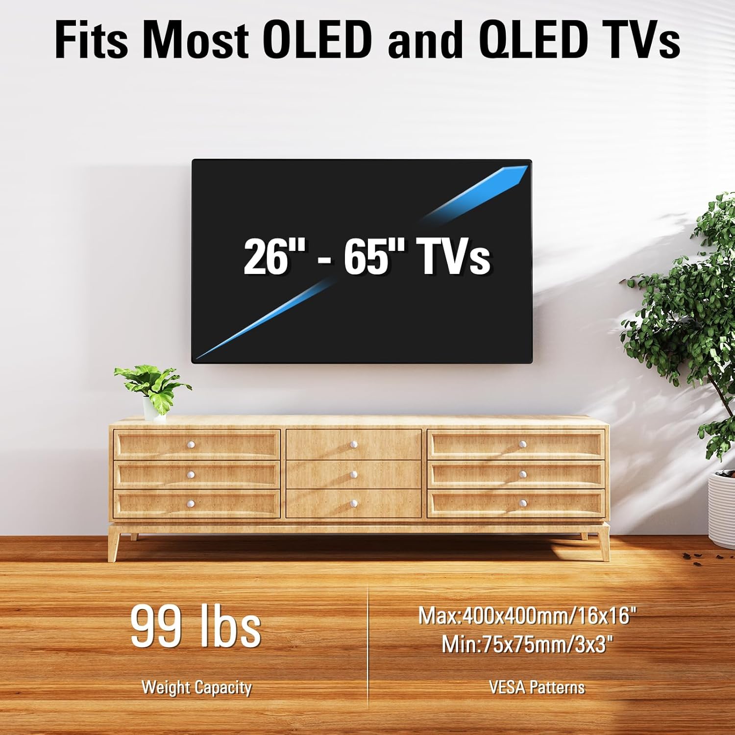 • Versatile Compatibility: This long arm TV wall mount fits most 26''-65" screens and can hold up to 99 lbs. Supports VESA min 75x75mm and max 400x400mm. It is perfect for installation in the living room, bedroom, office or any other place where a TV is needed. Tips:The TV plate is off center about 1.73"/44mm to the wall plate. Please consider this point, when positioning your TV on the wall.