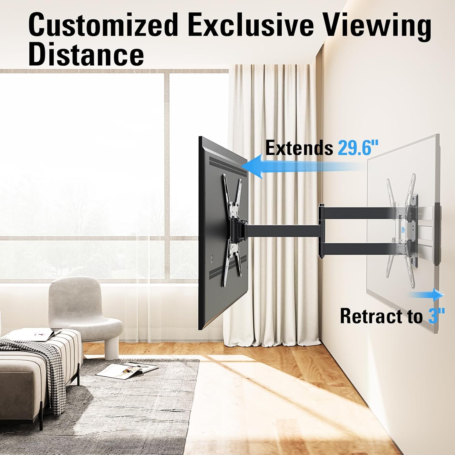 • 30" Long Extension: Want a TV wall mount Tv bracket with a flexible extension? This long extension TV wall bracket extends 30" from the wall to cover more viewing positions. What's more, retracting back to just 3" from the wall allows for space saving and a clean look. It is ideal for corner placement and you can watch TV anywhere you want.