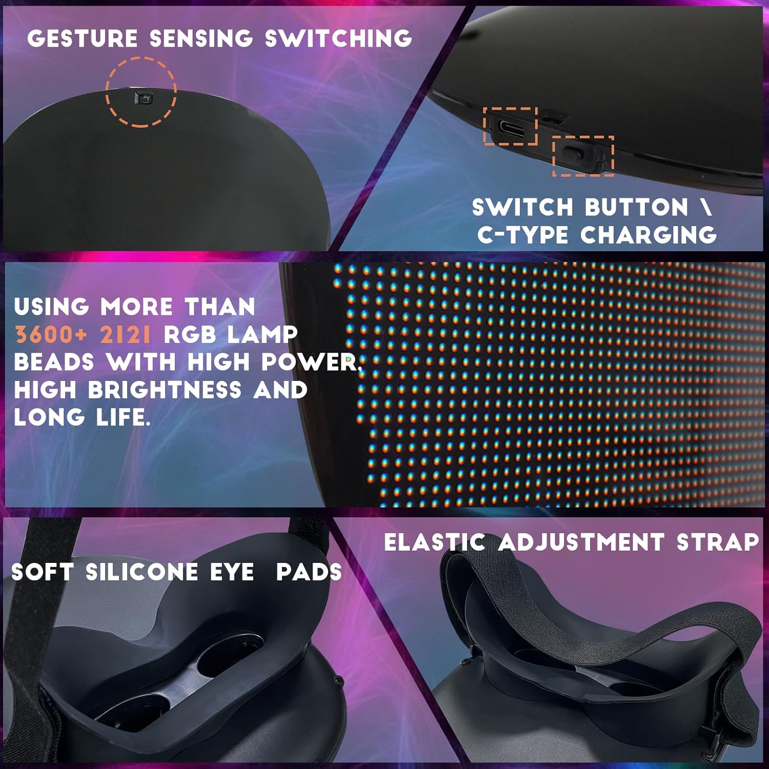 • [Comfortable to Wear and High-Quality]: The design of MOYACA LED Mask takes into consideration the importance of comfort, is both durable and long-lasting, it features silicone mat on the inside, design with the adjustable strap and large eye hole make it suitable for everyone. The bright and vibrant colors, along with the excellent graphics and animations, ensure that you'll grab everyone's attention.