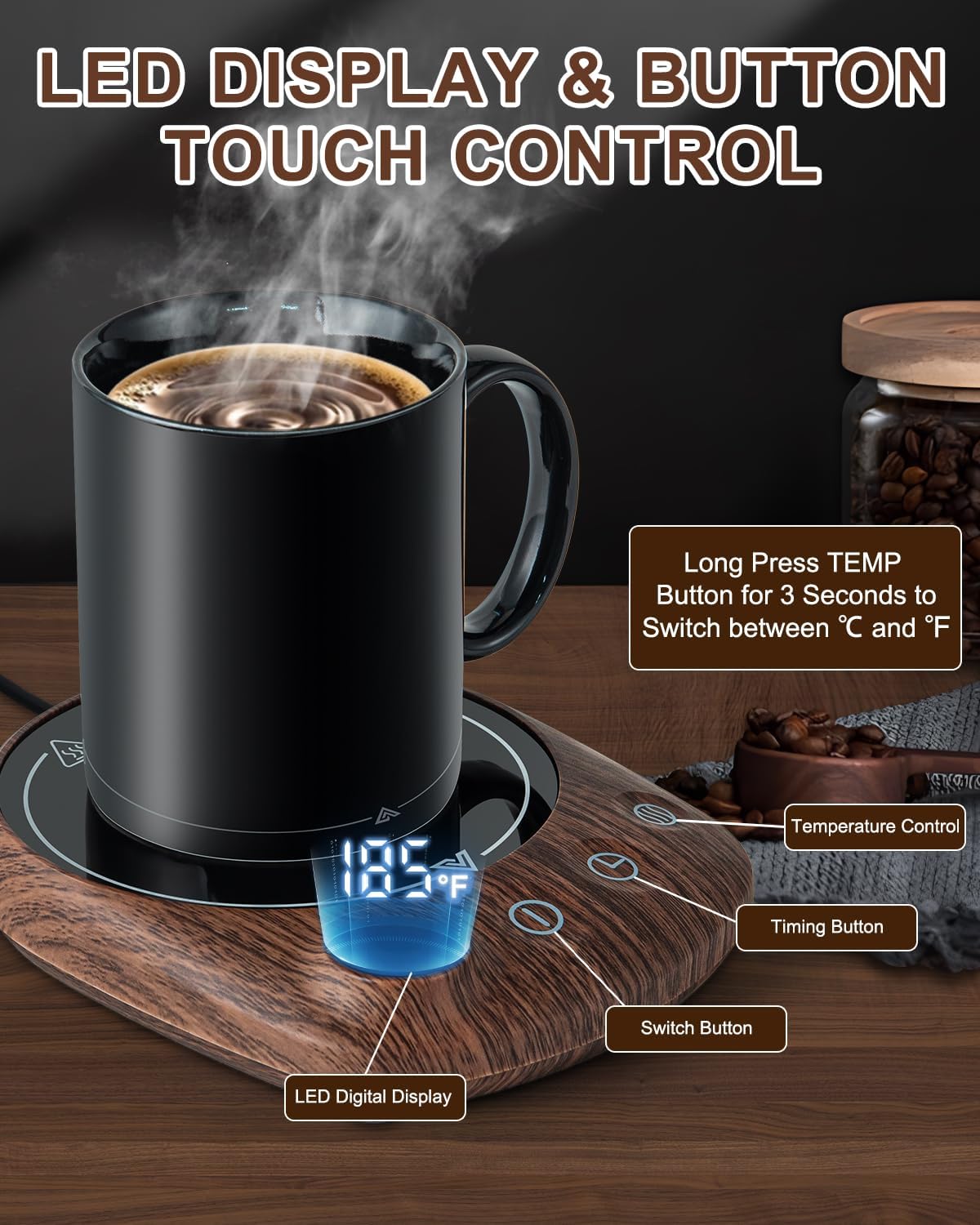 • Smart Auto Shut-Off & Timer: Set your desired warming duration (1-12 hours) using the intuitive timer button – Forgot to set the timer? No problem! Our intelligent coffee mug warmer includes a default 8-hour safety shut-off after continuous use. Prevents overheating, saves energy, and protects your desk – perfect for workdays, late nights, or cozy weekends