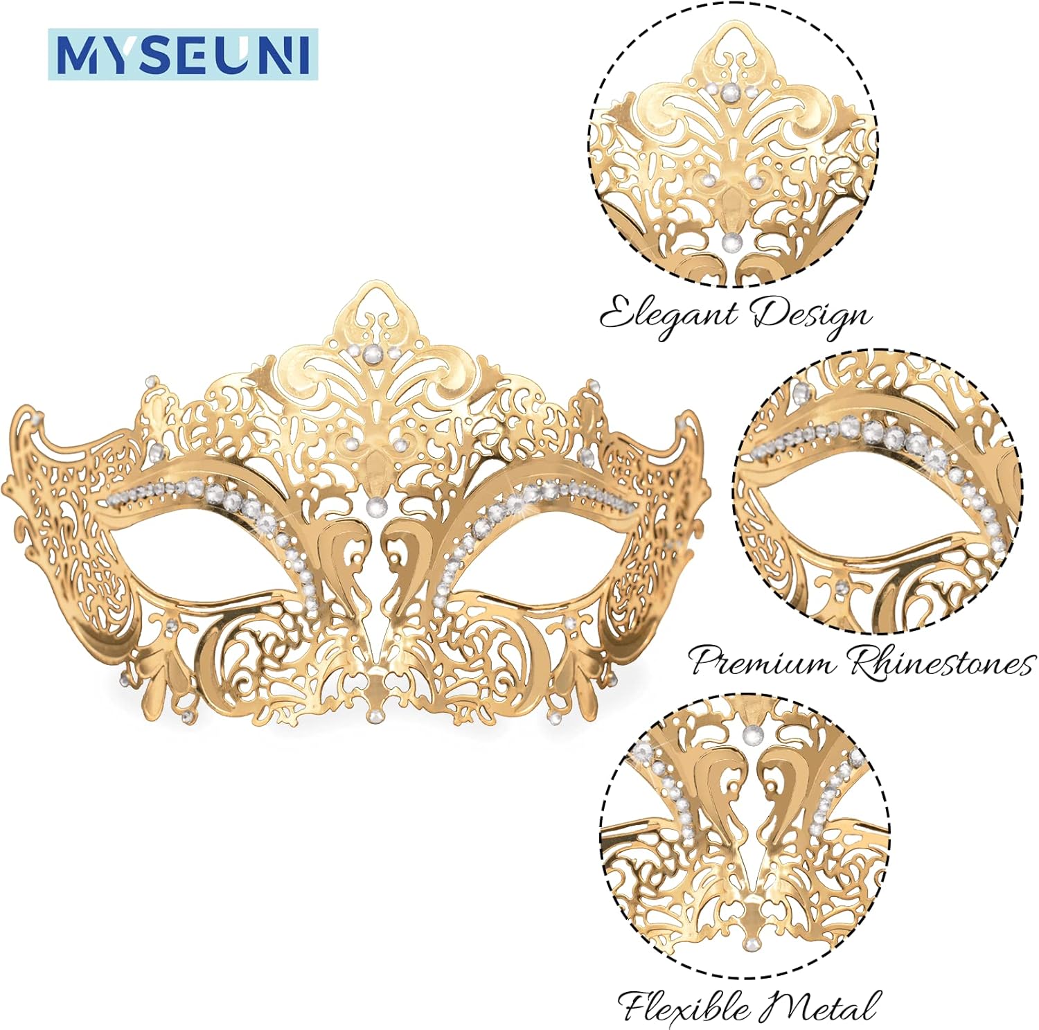 - Venetian Women Mask: The gold masquerade mask for women with rhinestone inlay for an eye-catching look