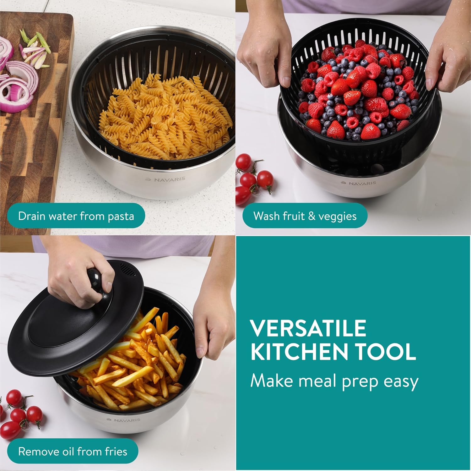 Navaris Salad Spinner with Lid - Salad Spinner Stainless Steel - Salad Dryer - Easy Washing, Drying and Spinning - Includes Grating and Slicing Discs