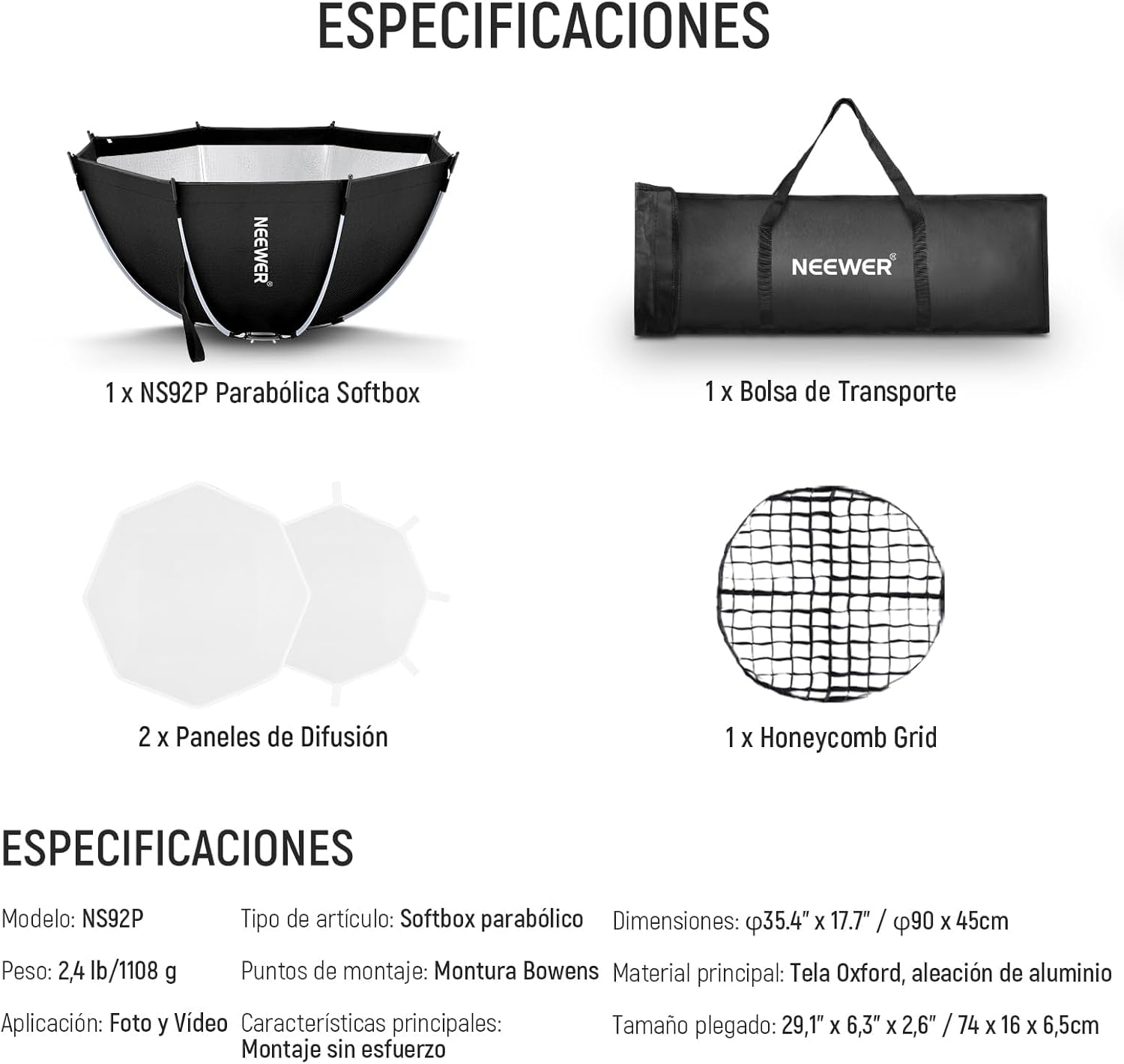 NEEWER 35.4'' Octagonal Softbox, Quick Release Parabolic Soft Box with Bowens Mount, Diffusers, Grid, Bag Compatible with Aputure 120d Compatible with Godox SL60w NEEWER Q4 AS600B CB300B Q300, NS92P