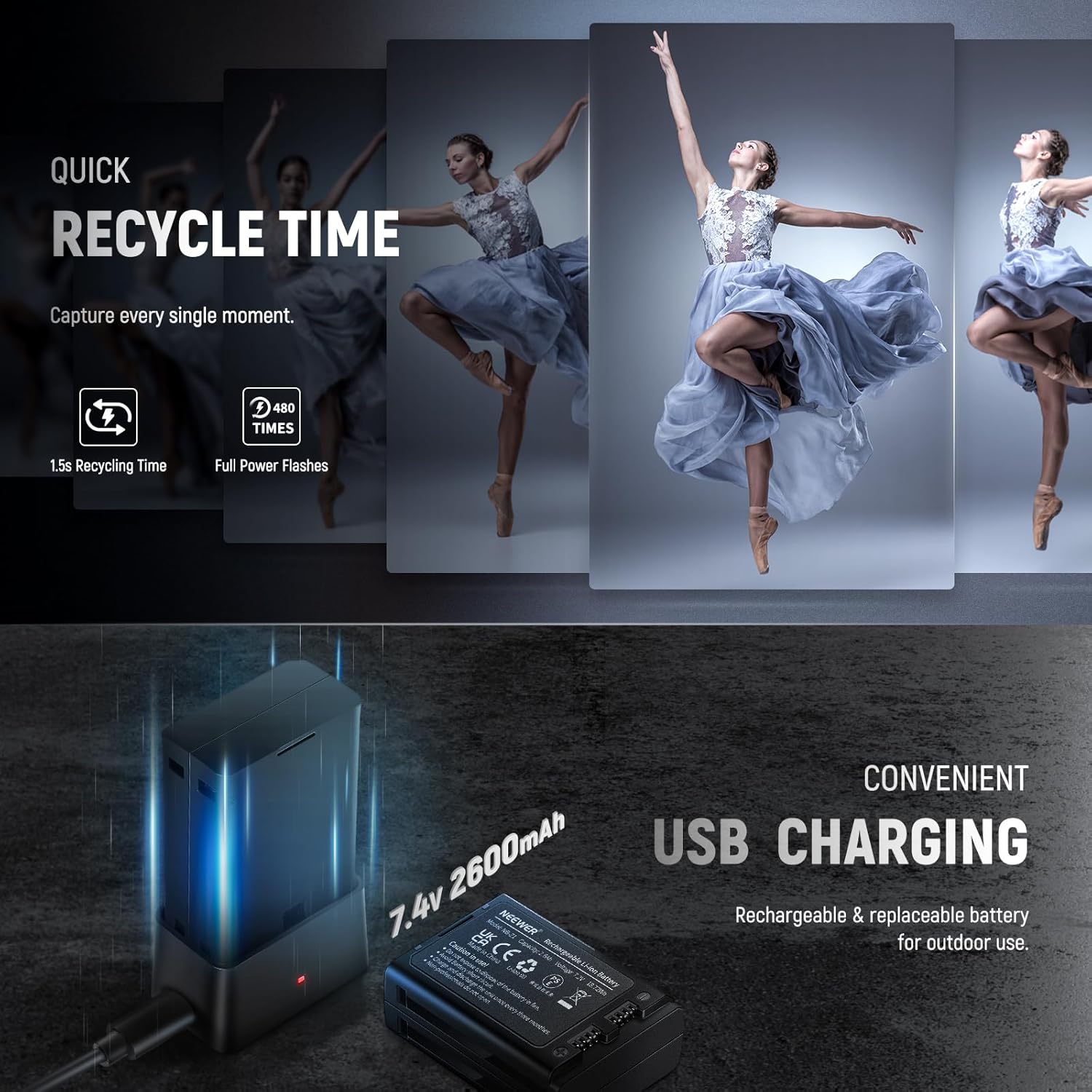 【High Capacity & Fast Recycling】 The 7.4V 2600mAh lithium battery (NB-Z1) provide 480 full power flashes, 1.5s fast recycling time and a flash duration from 1/180s and 1/20000s, perfect for capturing fast moving objects. Can also be powered via the included adapter and takes about 2 hours and 15 minutes to fully charge