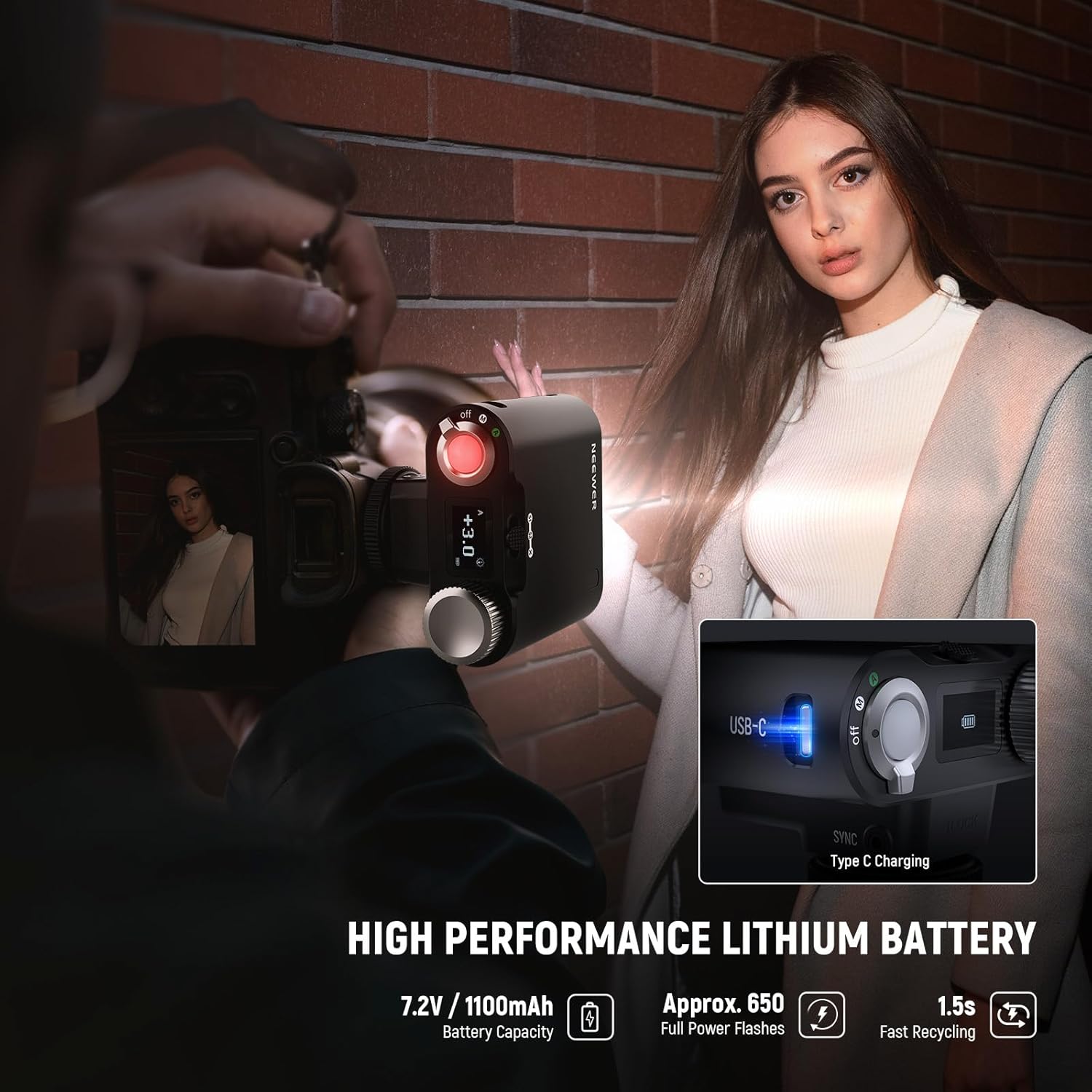 - 【Built in Lithium Battery】 The off camera flash lighting equipment features a 7.2V 1100mAh lithium battery, and can be recharged in just 1.5 hours with a 5V/2A input (a USB to Type C cable is included), enabling rapid recycling in 1.5 seconds and delivering up to 650 full power flashes. With built in safety protections against overcharge, over discharge, over current, and short circuits, this photography flash light ensures reliable use for every photo
