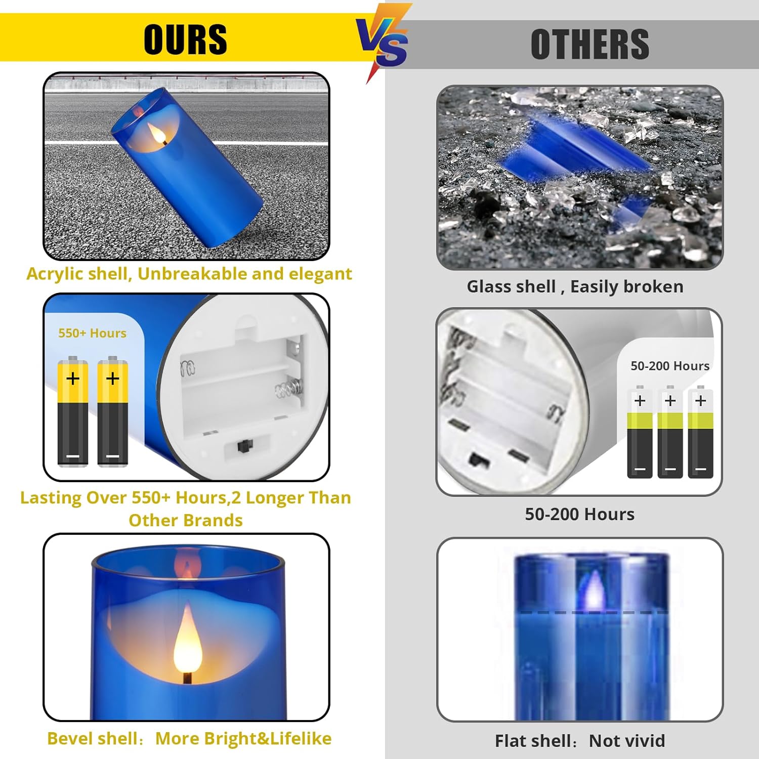 - Realistic Appearance, Unbreakable Material flameless candles are made of high quality imitation glass. Compared with glass radiance candles, acrylic shells make the battery candles stronger and lighter. Through the clear shell, you can see the moving wick dancing like real flame.