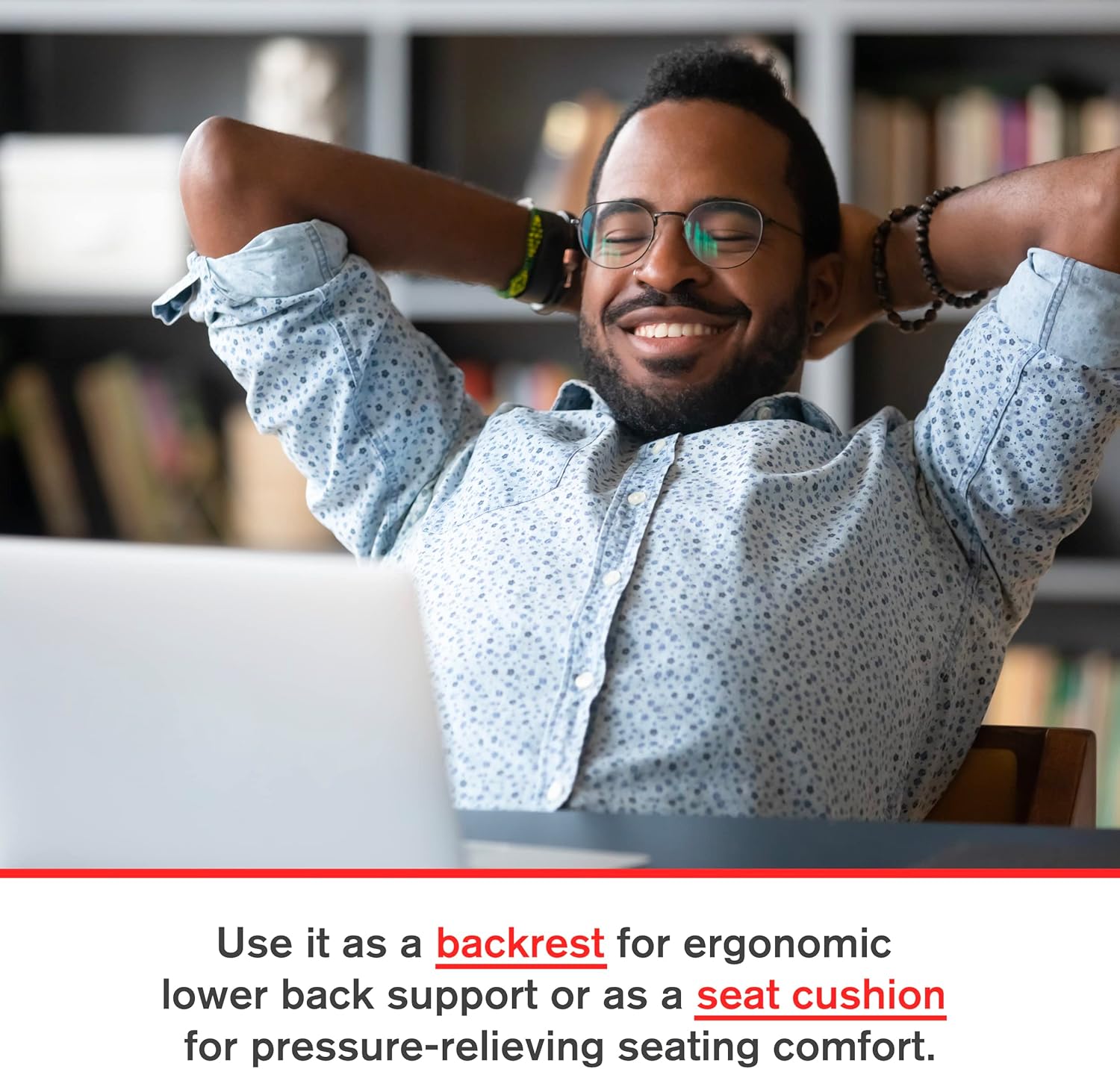 The ObusForme Sit-Back Cushion’s flexible, contoured ergonomic design gives you the choice of using it as a backrest or as a seat cushion. When used as a seat, the ergonomic lumbar support pillow reinforces your tailbone, sitting bone, and thighs to help evenly distribute body weight and provide comfort for extended periods of sitting. When used as a backrest, the cushion provides support and comfort for your lower back. Lightweight and portable, take the memory foam pillow with you and use it as car seat back support, a lumbar support pillow for office chairs, and more. The sit-back cushion measures 15” L x 15.5” W x 3.5” H. Upon unboxing the product, there may be a slight odor, but this is normal and will fade with time.