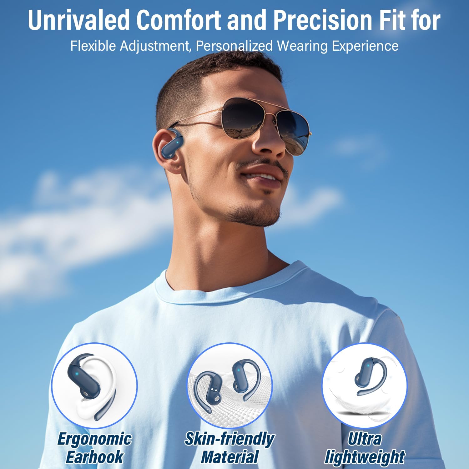 Open Ear Headphones, Bluetooth 5.4 Wireless Earbuds with HD Clear Calls, 32Hrs Immersive Stereo Air Conduction Earphones with Earhooks, LED Display, IPX7 Lightweight Open Ear Buds for Sports Blue