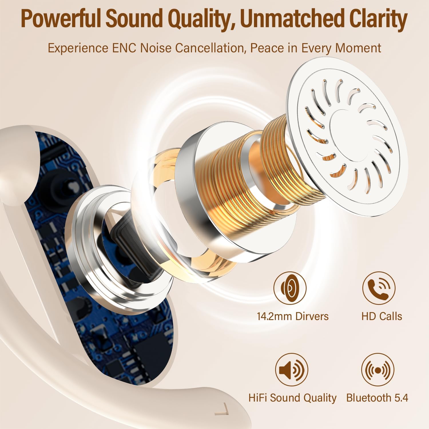 • Powerful Sound and Clear Calls: The wireless earbuds feature a 14.2mm large dynamic driver and precision acoustic tuning for an immersive stereo experience. The bass is rich, the mids are clear, and the highs are crisp, surrounding your ears. The built-in noise cancelling Mic enhances call quality, accurately capturing your voice while blocking out background noise. Whether on a noisy street or during a drive, your voice stays clear and smooth.