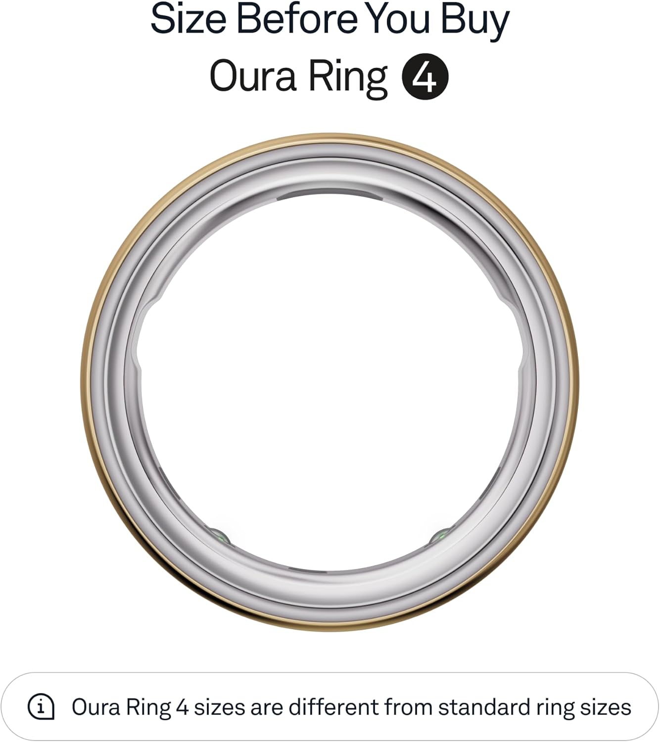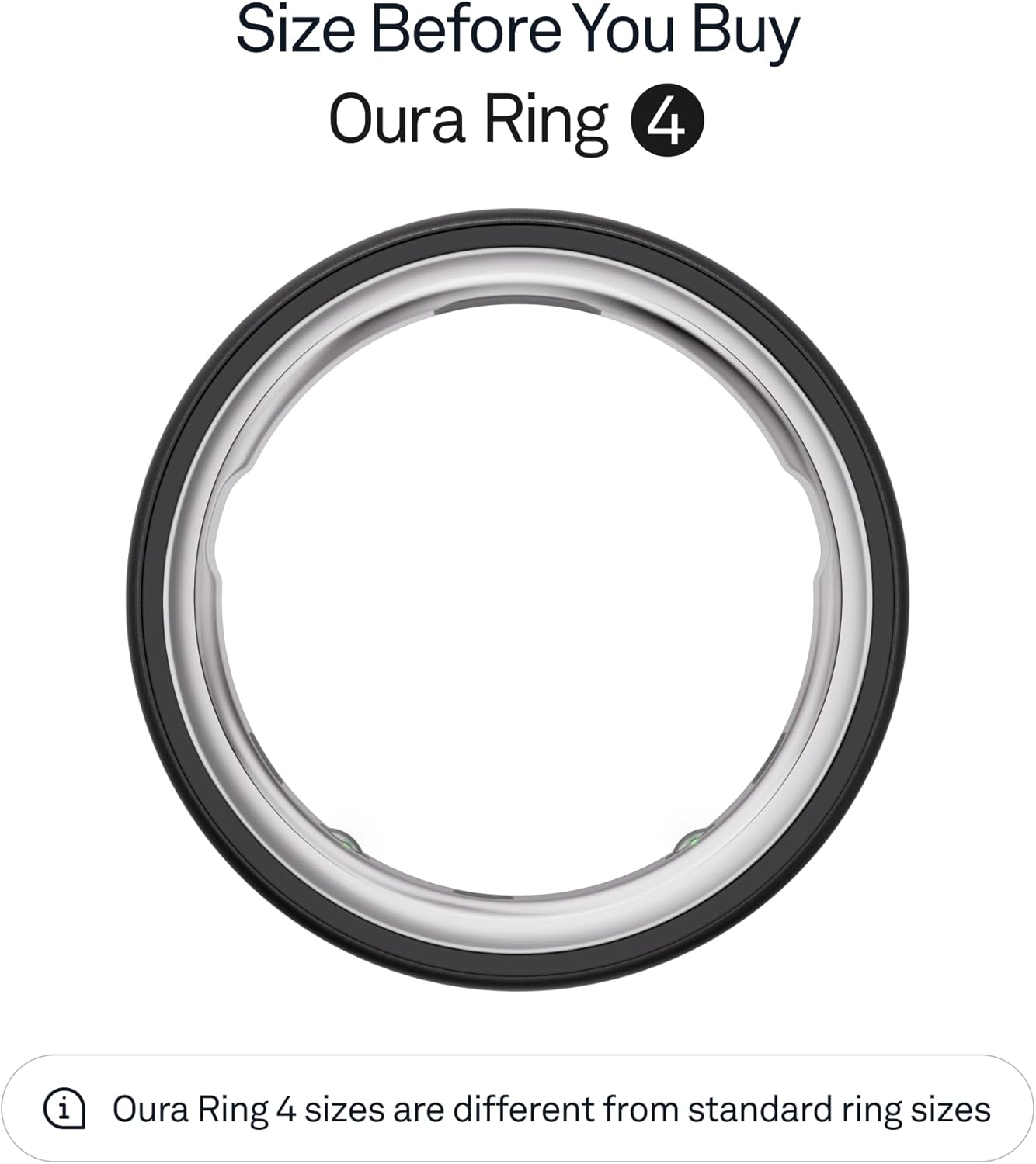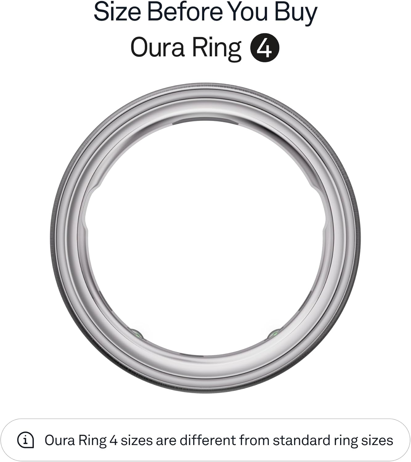 Introducing Oura Ring 4: the latest evolution of the revolutionary smart ring. Oura Ring 4 brings you closer to what matters most — your health. The updated all-titanium design is powered by Smart Sensing, a new sensing platform that doesn’t just measure your biometrics, it adapts to you, providing insights into over 30 biometrics including sleep, readiness, activity, heart health, stress, and women’s health. Oura Ring 4 quietly and comfortably monitors your health and with up to 8 days of battery life — you can forget it’s even on. Sleeker, smarter and more accurate than ever, Oura Ring 4 is made for you. IMPORTANT: Size yourself with the Oura Ring 4 Sizing Kit before you buy — Oura Ring 4 is not US standard sizing, and finding the right size will result in the best experience possible. With an Oura Ring 4 sizing kit purchase, a 10 credit will automatically be applied to your Oura Ring 4 at checkout.