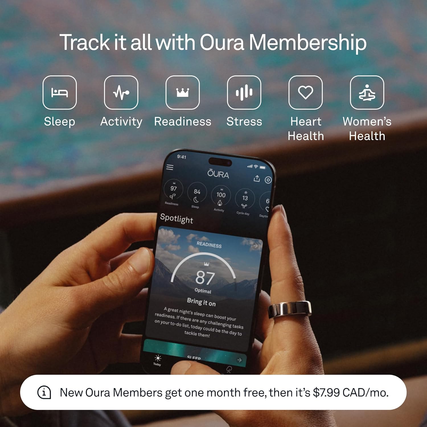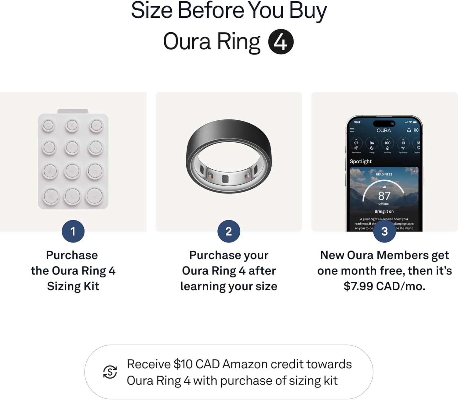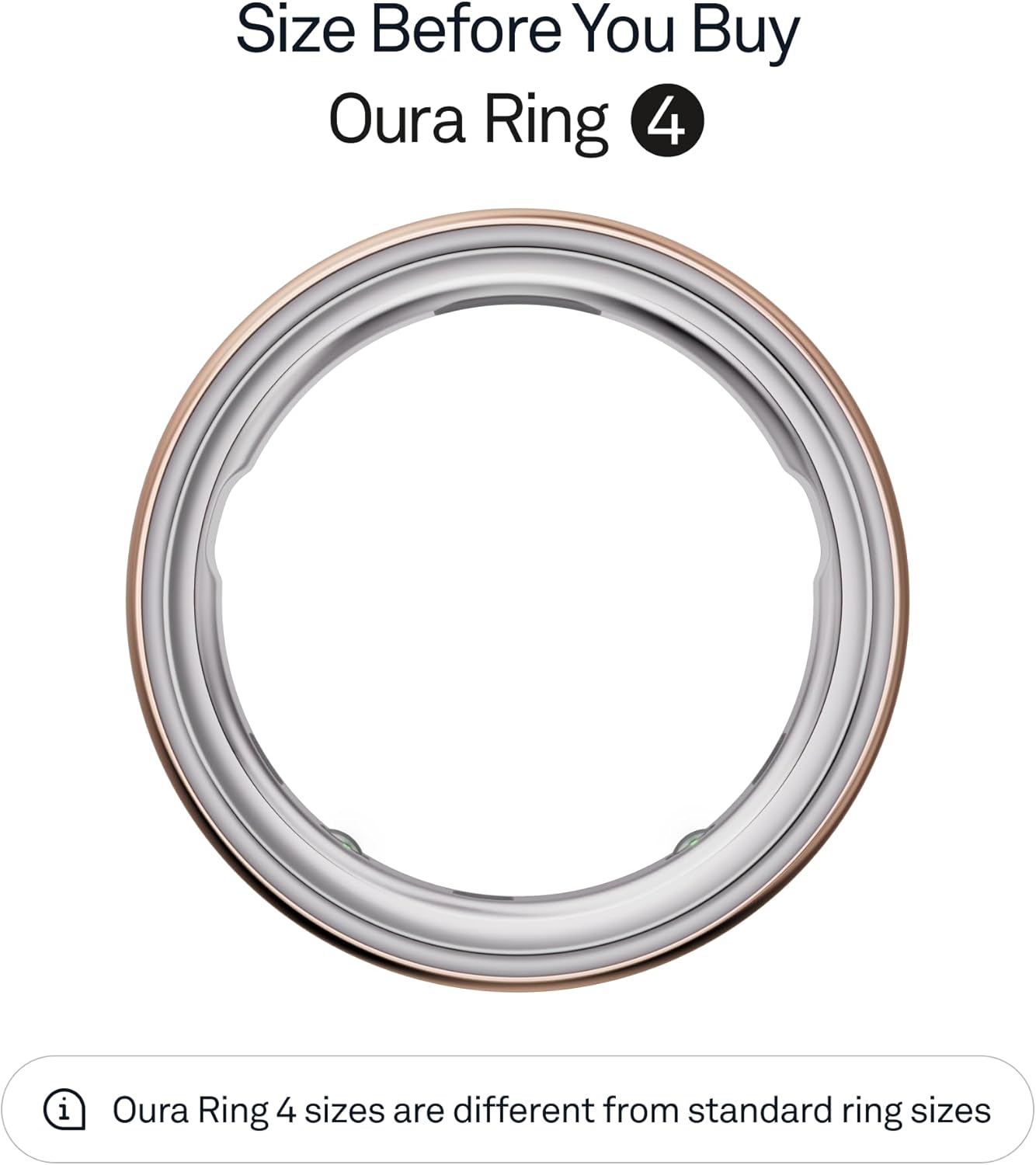 Introducing Oura Ring 4: the latest evolution of the revolutionary smart ring. Oura Ring 4 brings you closer to what matters most — your health. The updated all-titanium design is powered by Smart Sensing, a new sensing platform that doesn’t just measure your biometrics, it adapts to you, providing insights into over 30 biometrics including sleep, readiness, activity, heart health, stress, and women’s health. Oura Ring 4 quietly and comfortably monitors your health and with up to 8 days of battery life — you can forget it’s even on. Sleeker, smarter and more accurate than ever, Oura Ring 4 is made for you. IMPORTANT: Size yourself with the Oura Ring 4 Sizing Kit before you buy — Oura Ring 4 is not US standard sizing, and finding the right size will result in the best experience possible. With an Oura Ring 4 sizing kit purchase, a 10 credit will automatically be applied to your Oura Ring 4 at checkout.