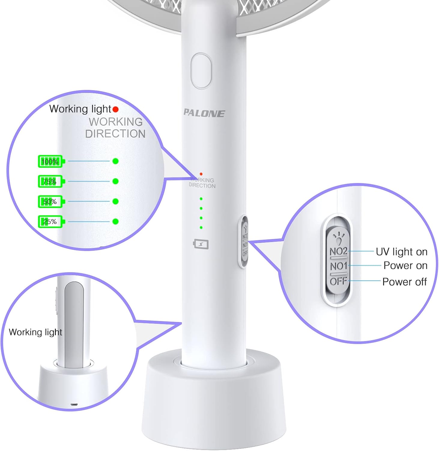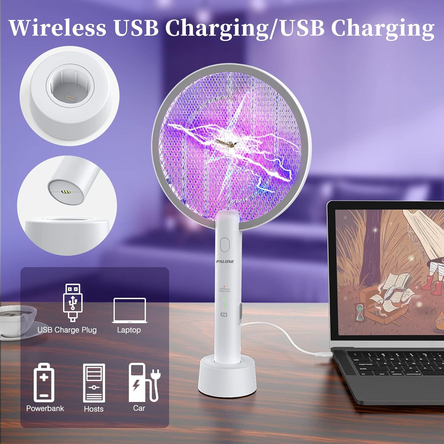 • 【Easy to Operate】 Its convenience is embodied in its portability and easy charging way. The bug zapper racket is portable and has comfortable hand feeling. Its automatic mode can also free your hands. It is useful for indoors and outdoors. As for the battery charging, you can switch off the fly zapper racket, insert it into the charging base, and then connect the base's USB cable to an available power source