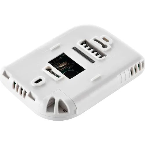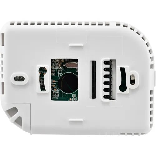 The programmable thermostat supports scheduled time, temperature, and fan operation control for indoor residential, office, and commercial applications. The 4 wiring terminals are located on the back of the thermostat to support different mode types. The batteries must be installed with the correct polarity and battery type for proper unit functionality. Includes 2 wall anchors and mounting holes for easy inner wall installation. Must be installed by trained service personnel. White color finish.