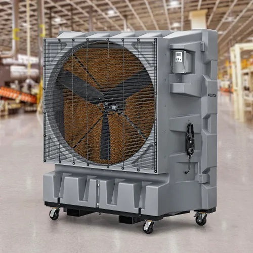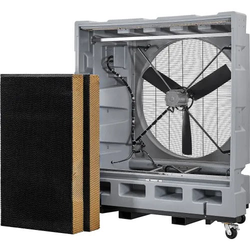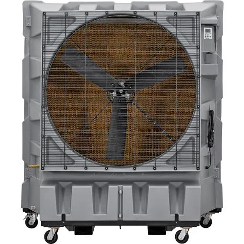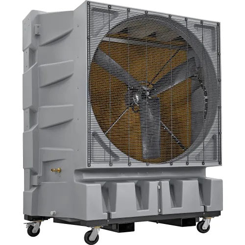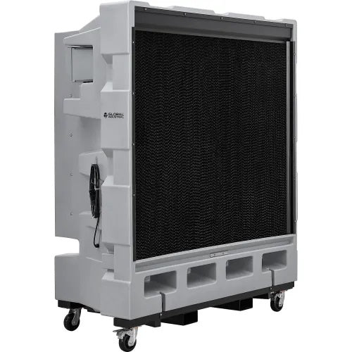 Beat the humidity and the heat with the Global Industrial™ 48" Portable Evaporative Cooler, a low-cost, environmentally-friendly solution to keeping spaces cool. Water and forced air are combined in this machine to reduce air temperatures by as much as 26°F. Units are equipped with thick media paper that is coated in water from the pump. The coolers come with a convenient remote control and a micro-computer control panel with easy-to-read LCD display. A built-in timer allows the cooler to be programmed to turn on or shut off at preset times. Additionally, an Auto-Shutoff function for the pump motor prevents damage if water levels drop below a minimum limit. Its 48" diameter fan operates at three selectable speeds and a thick cooling pad ensures reliable heat absorption. Four rubber casters, two with brakes, allow easy mobility along with built-in forklift pockets. ETL & cETL Listed. 1-Year Limited Warranty.