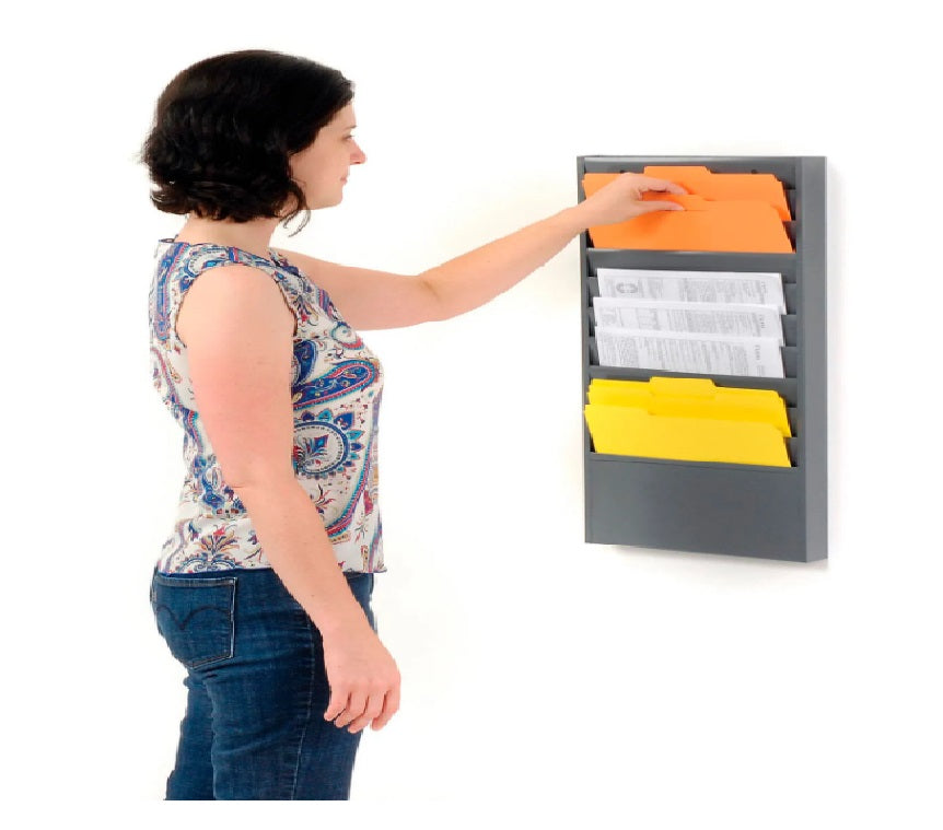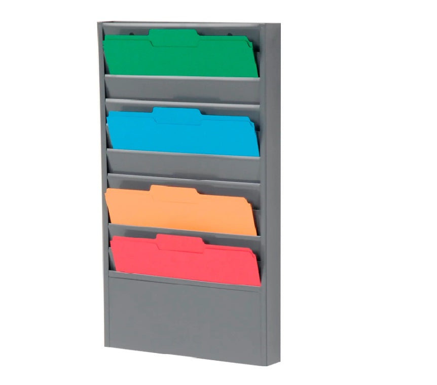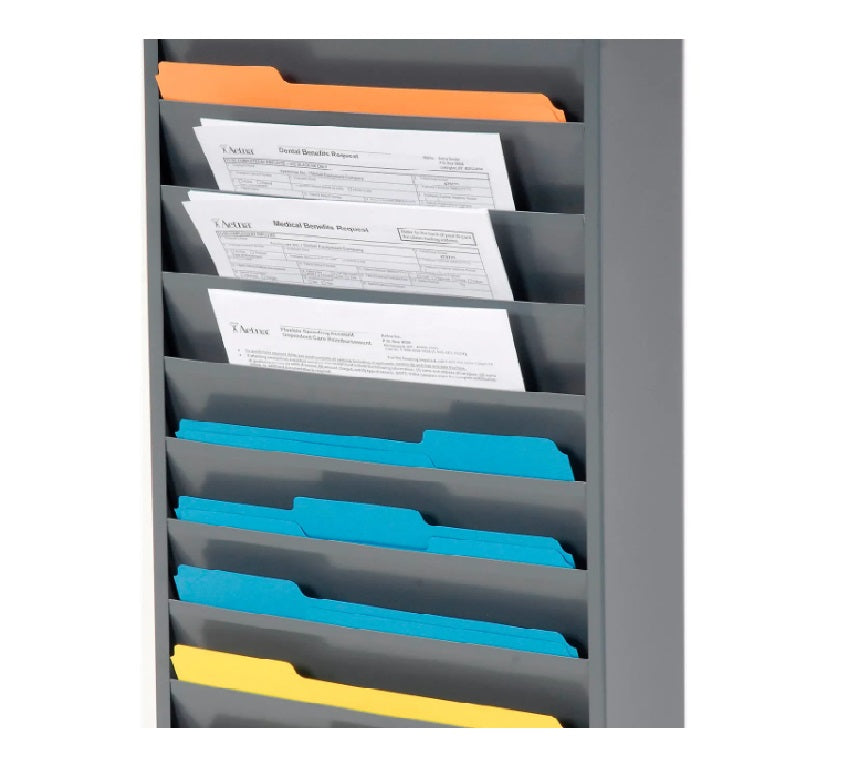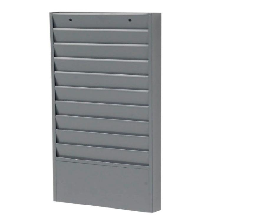 Prime cold rolled all steel construction with durable powder coat finish. Ideal for special forms and work orders and the pockets are 12-1/4" wide and 5-3/4" high. Holds literature up to 5/16" thick. Keyhole slots in the back make wall mounting easy. The unit ships fully assembled ready for use. 10 Pockets. 13-1/4"W x 1-15/16"D x 26-1/4"H overall. Gray finish.