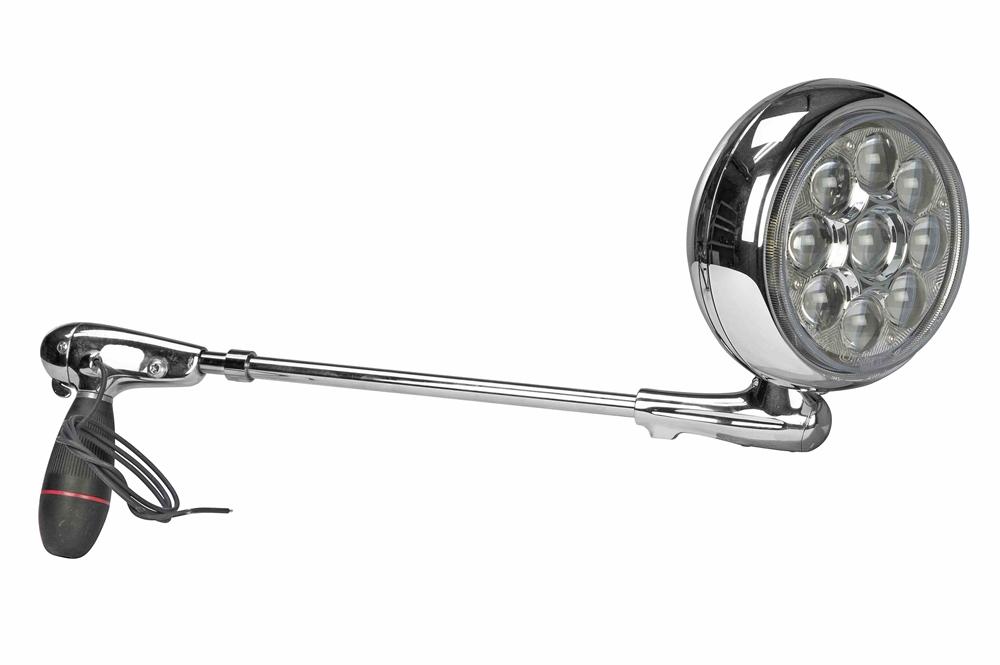 LED Post Mount Spotlight - 6 inch - 30W LED Bulb Operation: Operator controls rotation and elevation of spotlight outside of vehicle by twisting and turning a handle on the inside of the vehicle. Operator remains protected from the elements and can position the beam quickly and easily. The beam remains where the operator places it until the handle is moved. Format: 6 inch round ABS housing (no rusting). Chrome models are ABS plastic with a chrome dip Colors: Available in Chrome and Black Housing (shaft is chrome and handle is black) Shaft: Stainless steel with triple plate chrome coating Handle: Black rubberized handle Switch: Thumb activated toggle on the top rear of the handle Voltage: Available in 12 Volt, 30 watt Lens Type: Clear polycarbonate   Beam Type: Spot beam Beam Length: 600 feet projection Bulb Type: 30 watt LED Candlepower: Industrial candlepower: 215,000 Electrical: Single positive lead from handle connects to vehicle power. Spotlight grounded via mounting kit to vehicle chassis Amp draw: 2.5 amps on 12 volts
