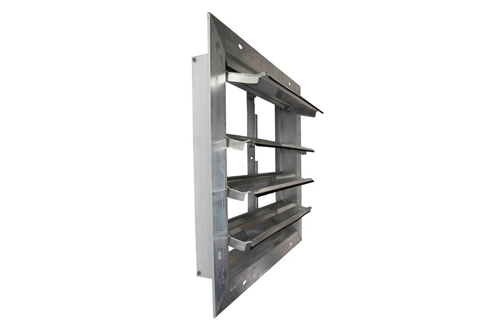 | 14" Exhaust Gravity Air Louver for 12" Fans This gravity damper wall shutter is designed for 12" fans and installment in horizontal fan exhaust applications and requires air pressure and air flow to open. This unit has a max velocity of 2000 fpm. The frame and tie rods are constructed of G-90 galvanized steel, and the blades are made of mill finished aluminum. The shutter frame measures 2-1/4" in depth with an open depth of 6-1/4". The shutter overall square measures 23"Â and is compatible with Larson Electronics EPF-LPSM and EPF-HPSM series explosion proof fans. |